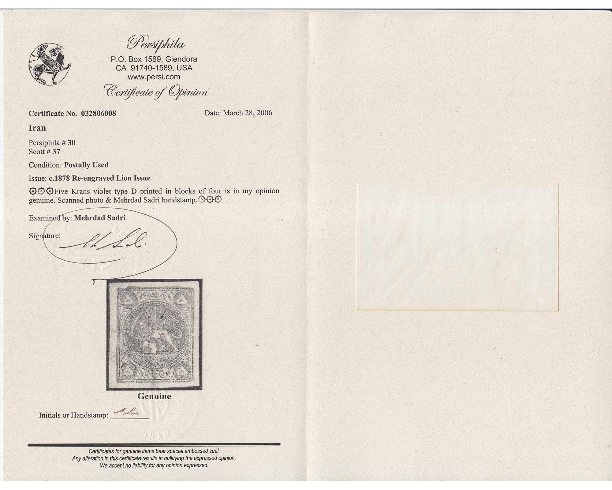 1878 5 Kran Violet Type D Certificate By Mr. Sadri