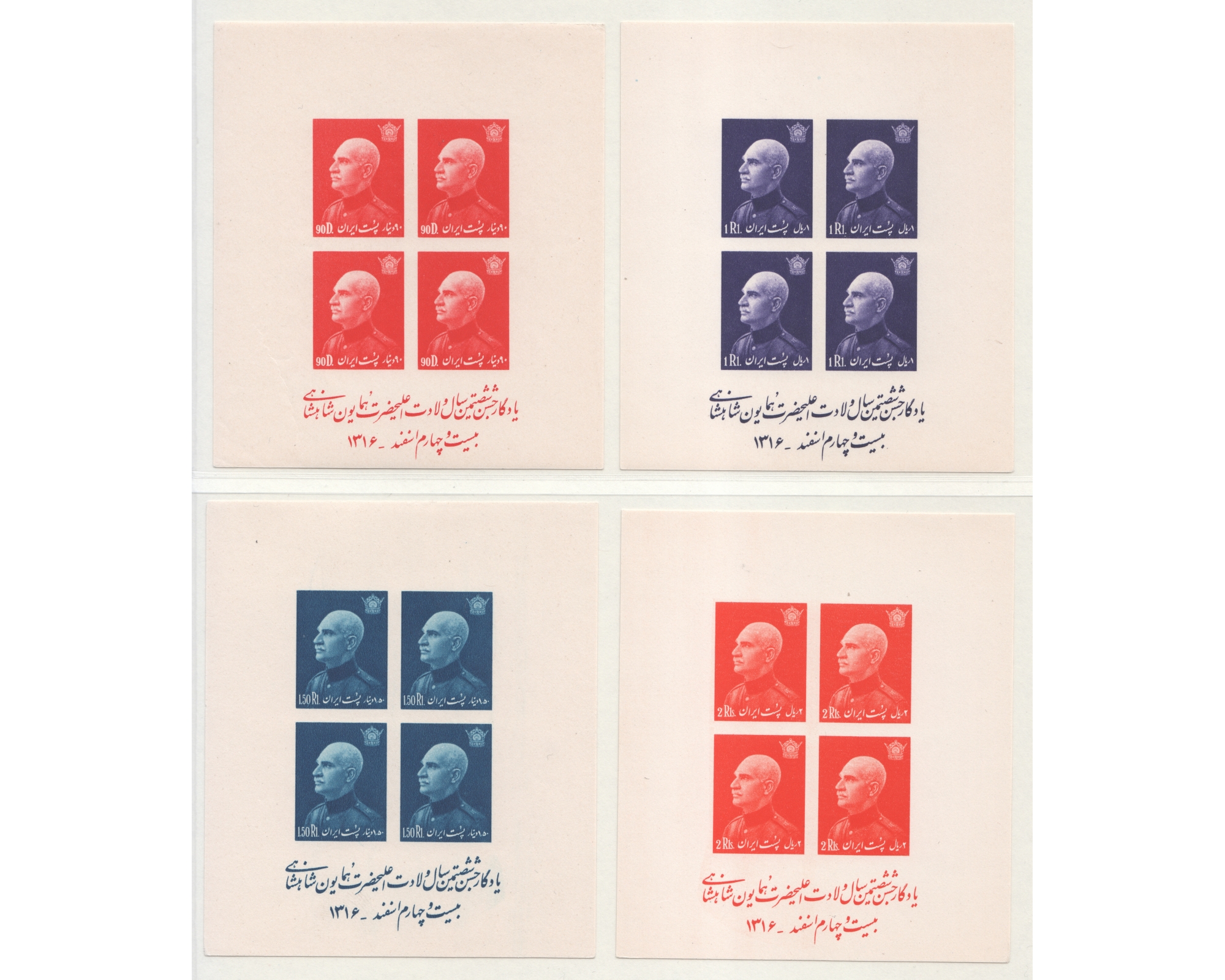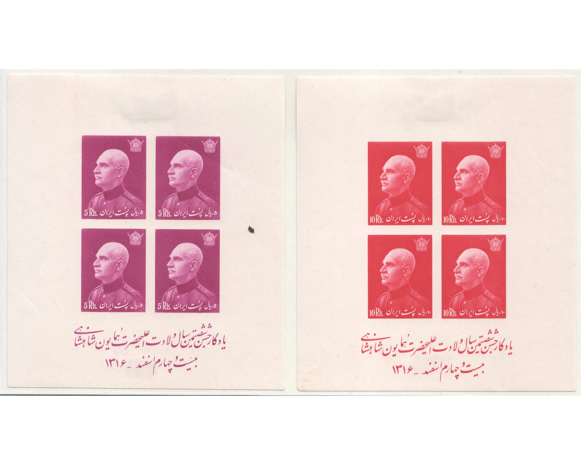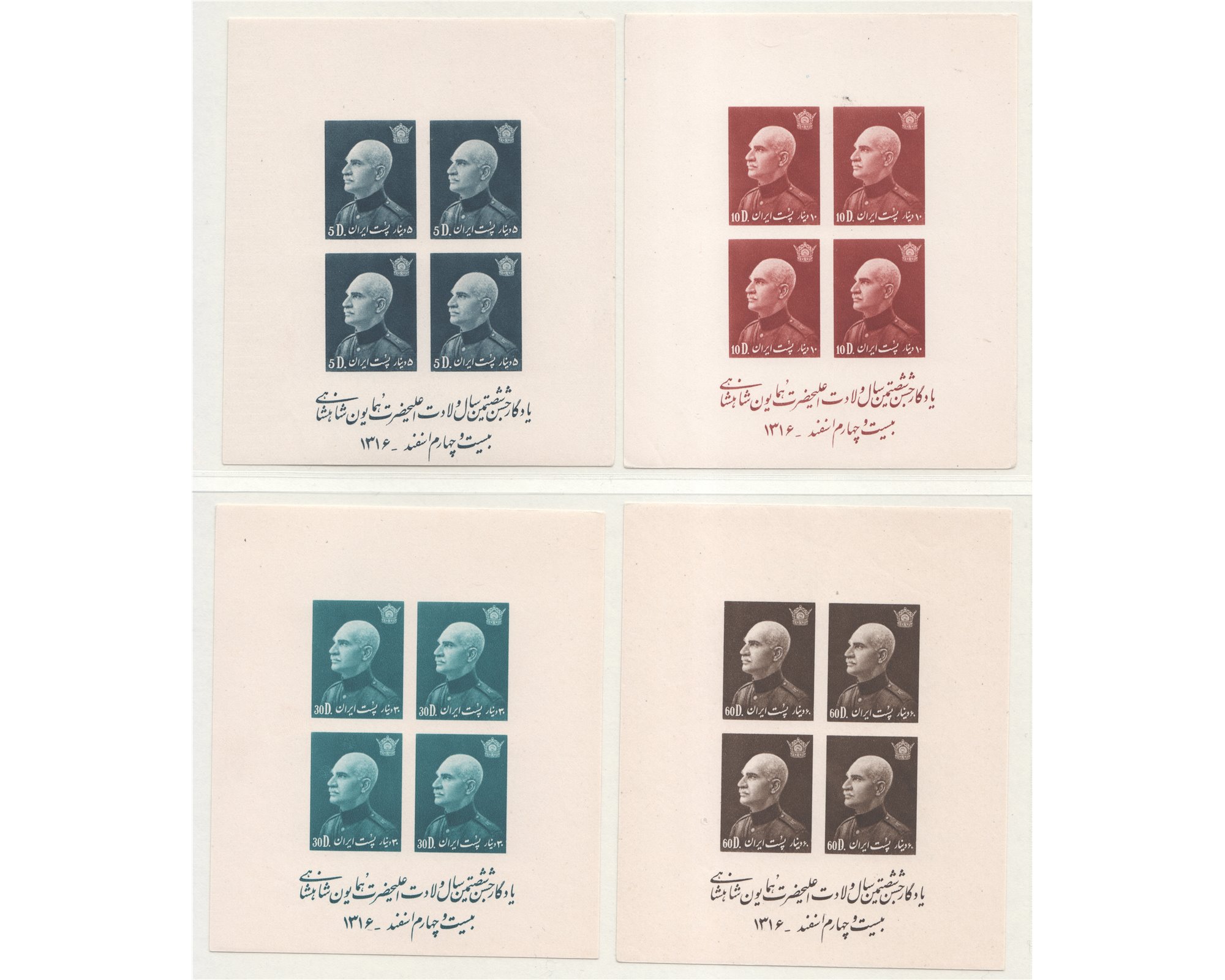 سال ۱۳۱۶ـ بلوک بی دندانه شصتمین سال تولد رضا شاه پهلویپنج ریال و ده ریال با شارنیه کلیه بقیه ارقام بدون اثر شارنیه
