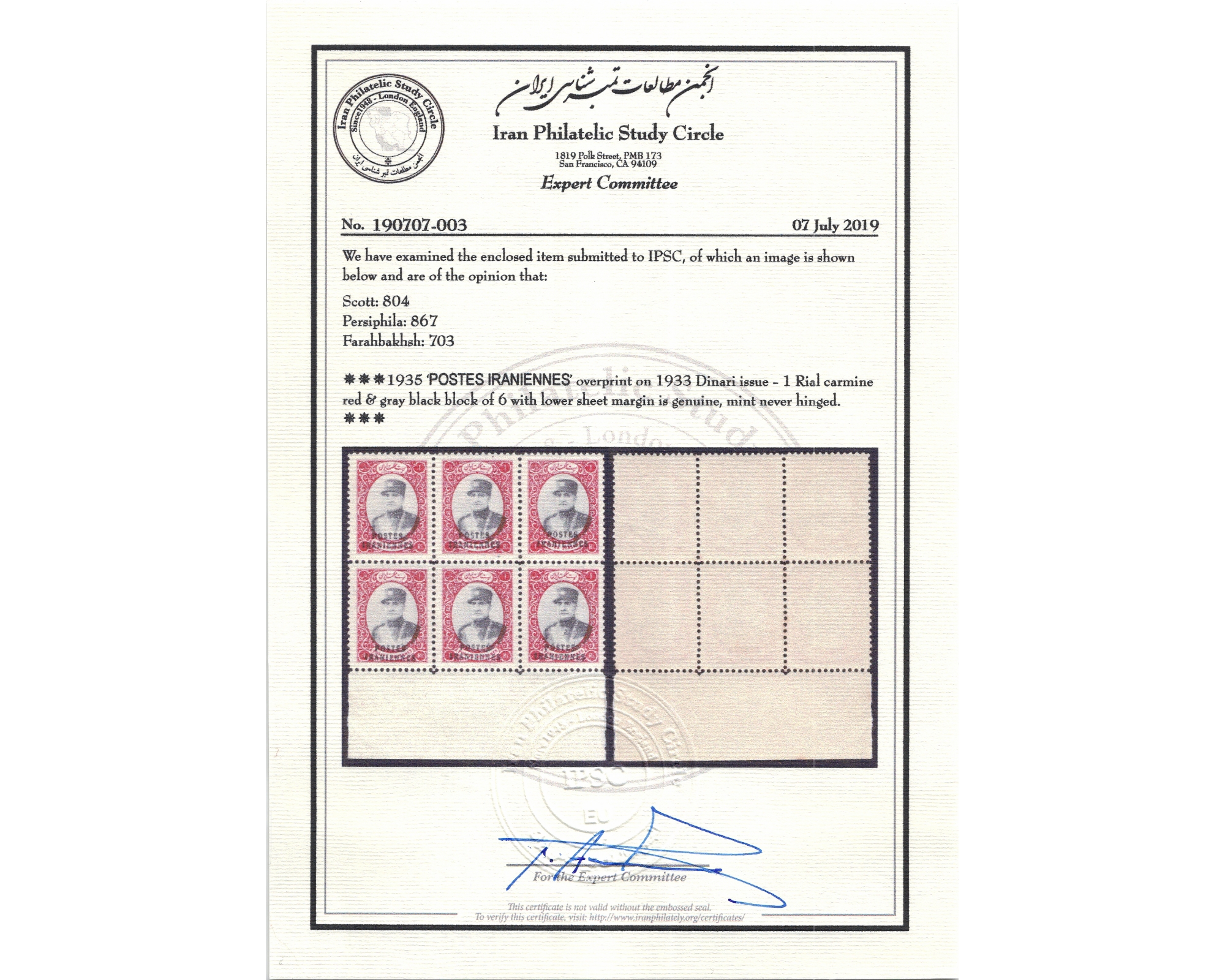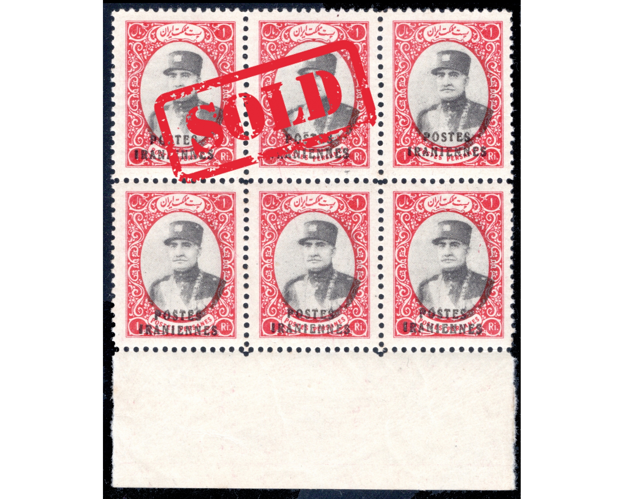 1935 1 Rial Postes Iranians on Dinari Block of 6Certificated by IPSC Condition; Mint Never Hingedبدونه اثر شارنیه ـ کیفیت چسب عالی