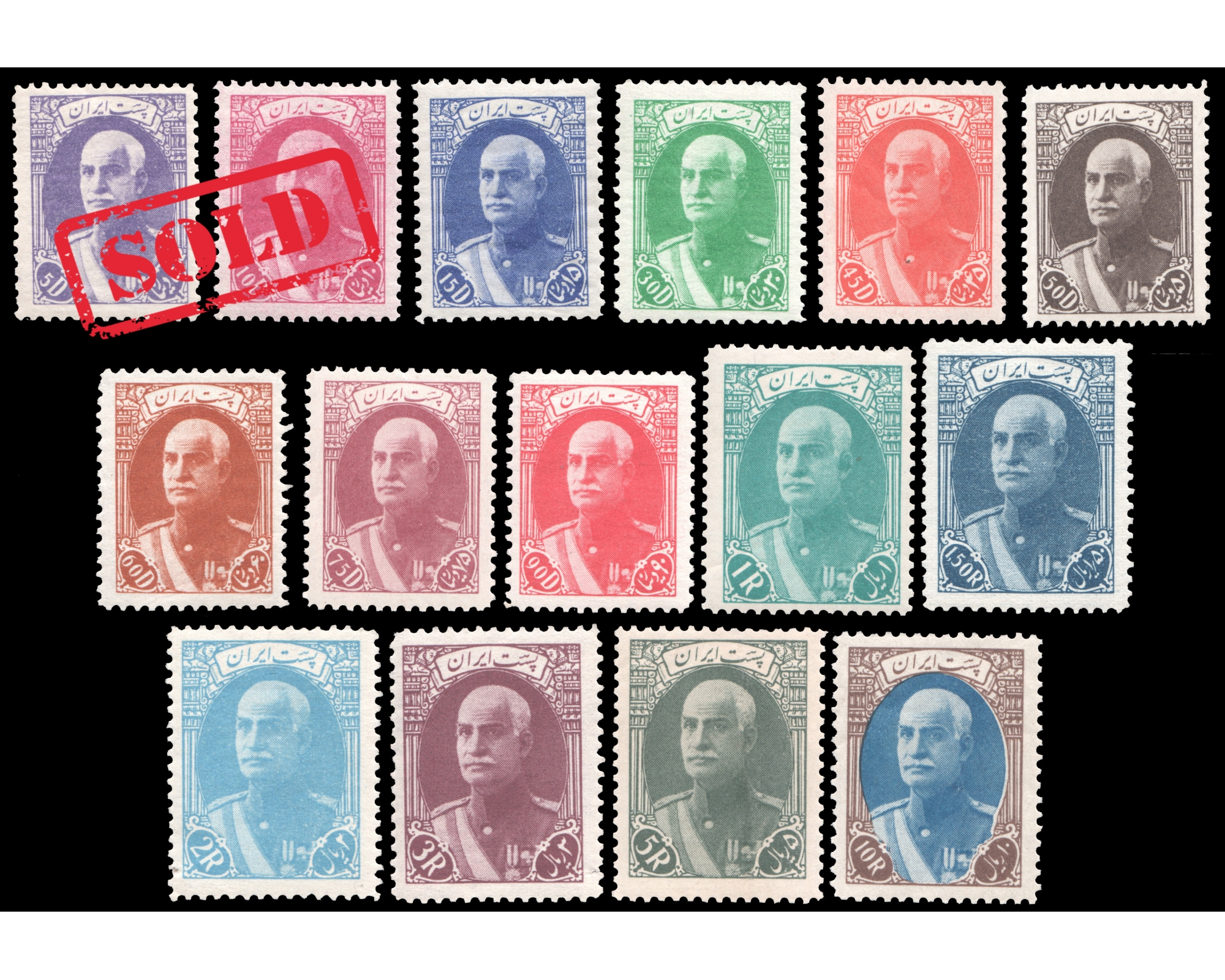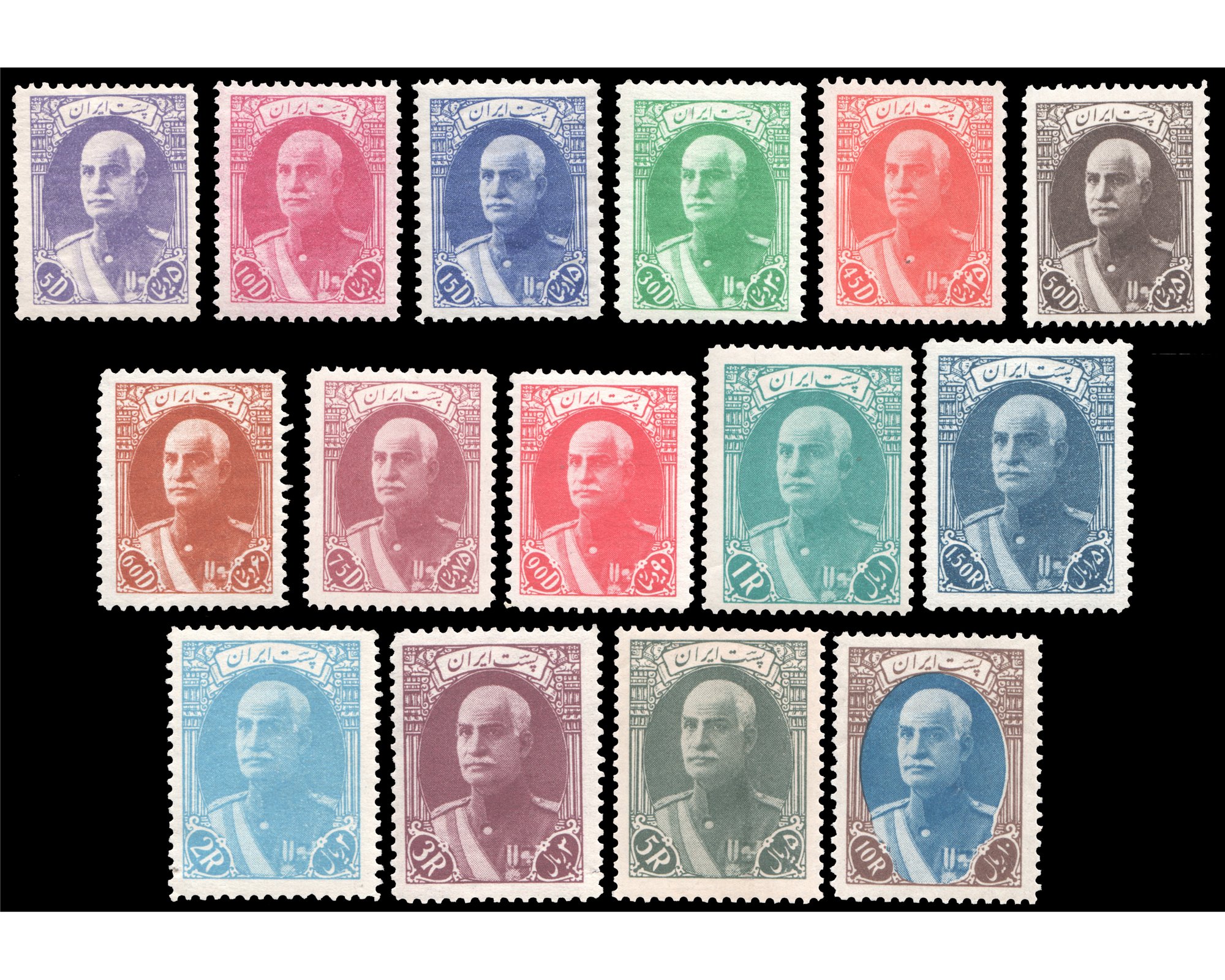 سری سر برهنه بدون زیرنویس رضا شاه پهلوی Condition; Mint Never Hinged, only 10 Rial light crease تمامی ارقام بجز ۱۰ ریال بدونه اثر شارنیه ـ کیفیت چسب عالی تمبر ۱۰ ریال شکستگی خیلی ظریف که فقط از پشت تمبر دیده می شود