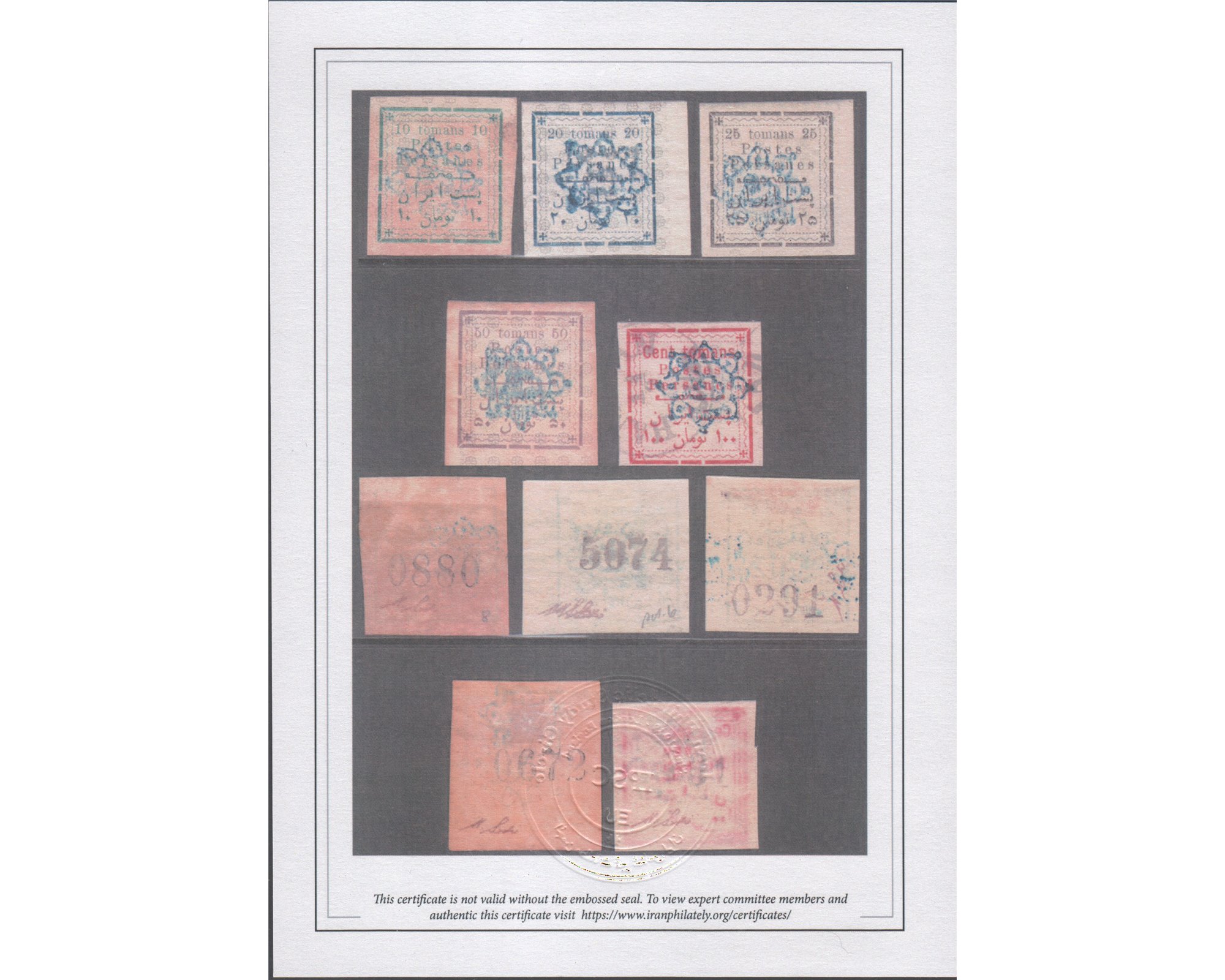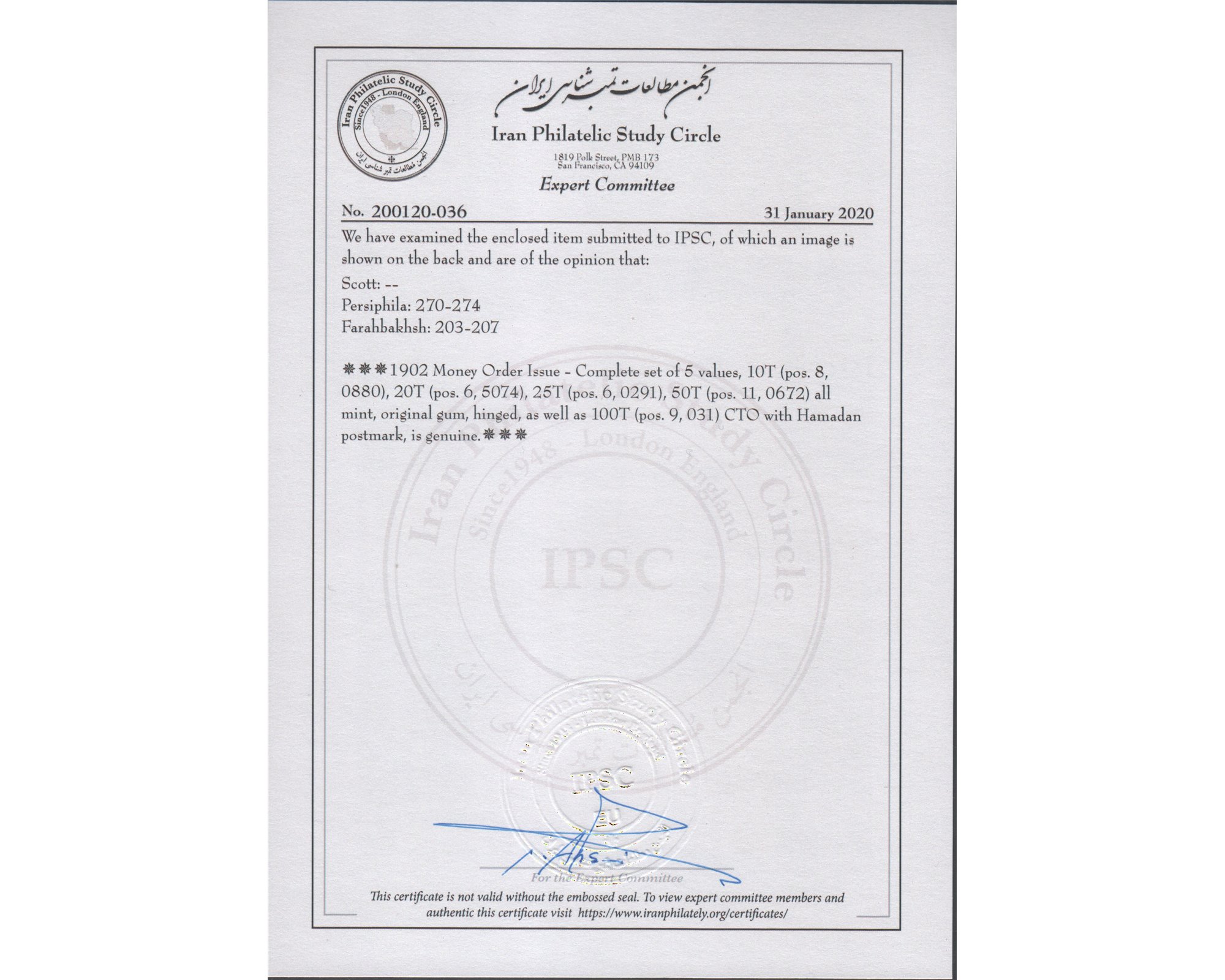 1902 Money Order Full Set Mint with IPSC Certificate Condition: 10Tuman to 50 Tuman Mint Lightly Hinged 100 Tuman Postaly Used Extremely Rare issue in Mint condition