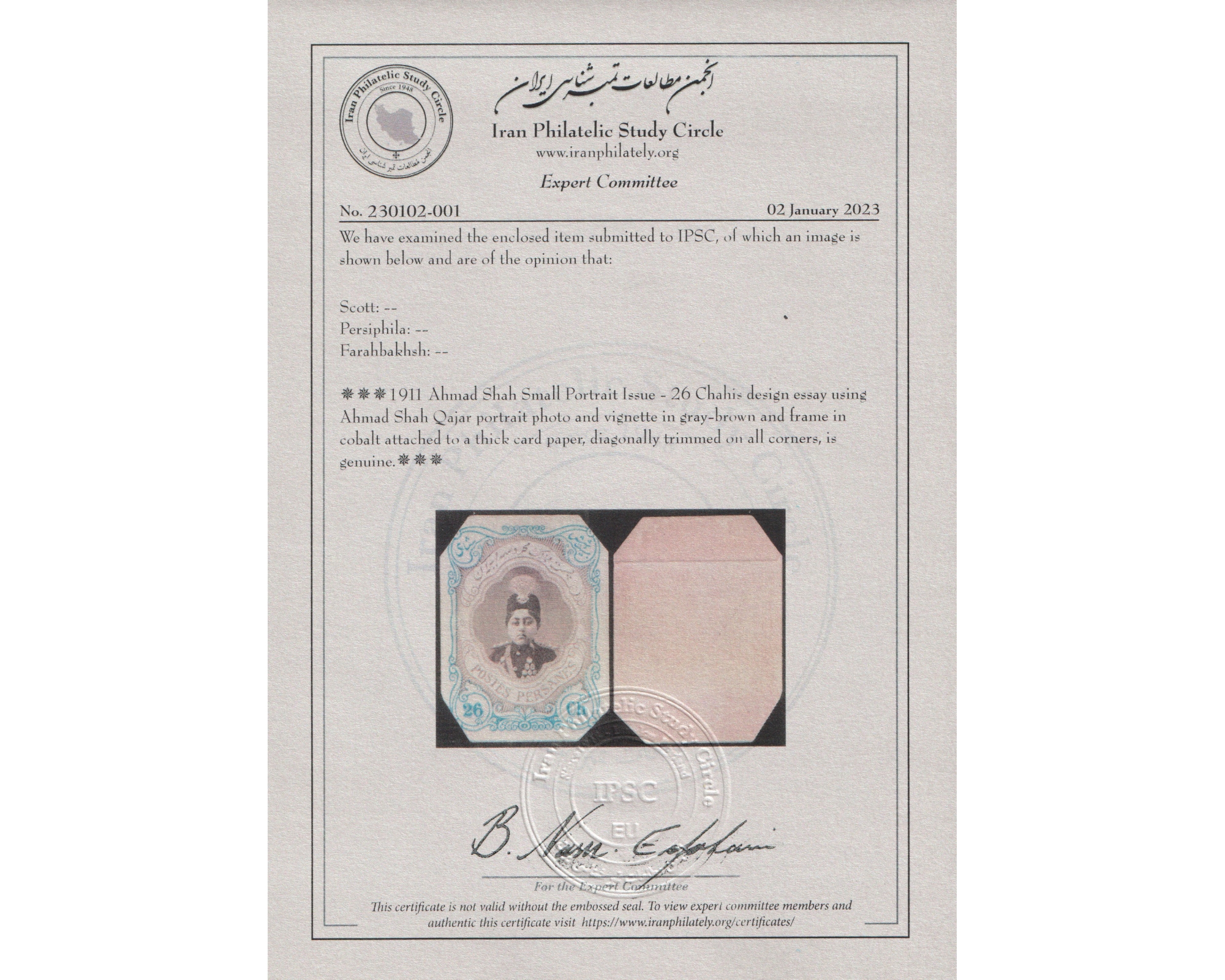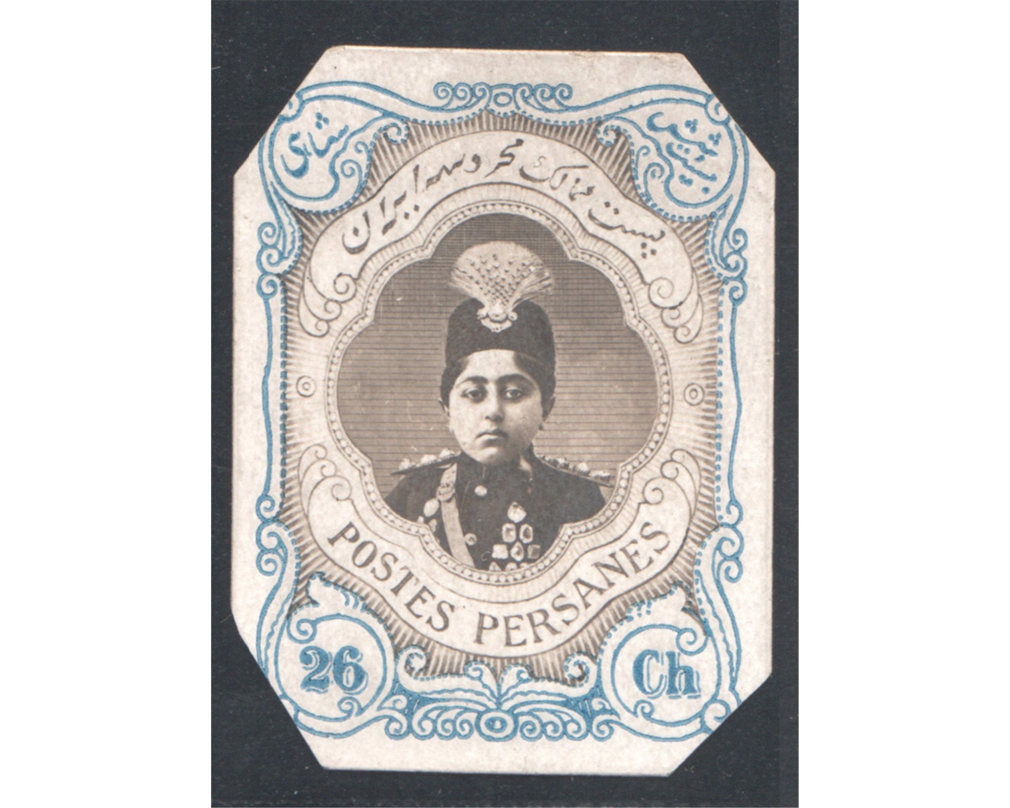 Ahmad Shah Short Portrait Color Plate Proof 26chAngles are cut out Imperf. Plate Proof on Thick un gumed card