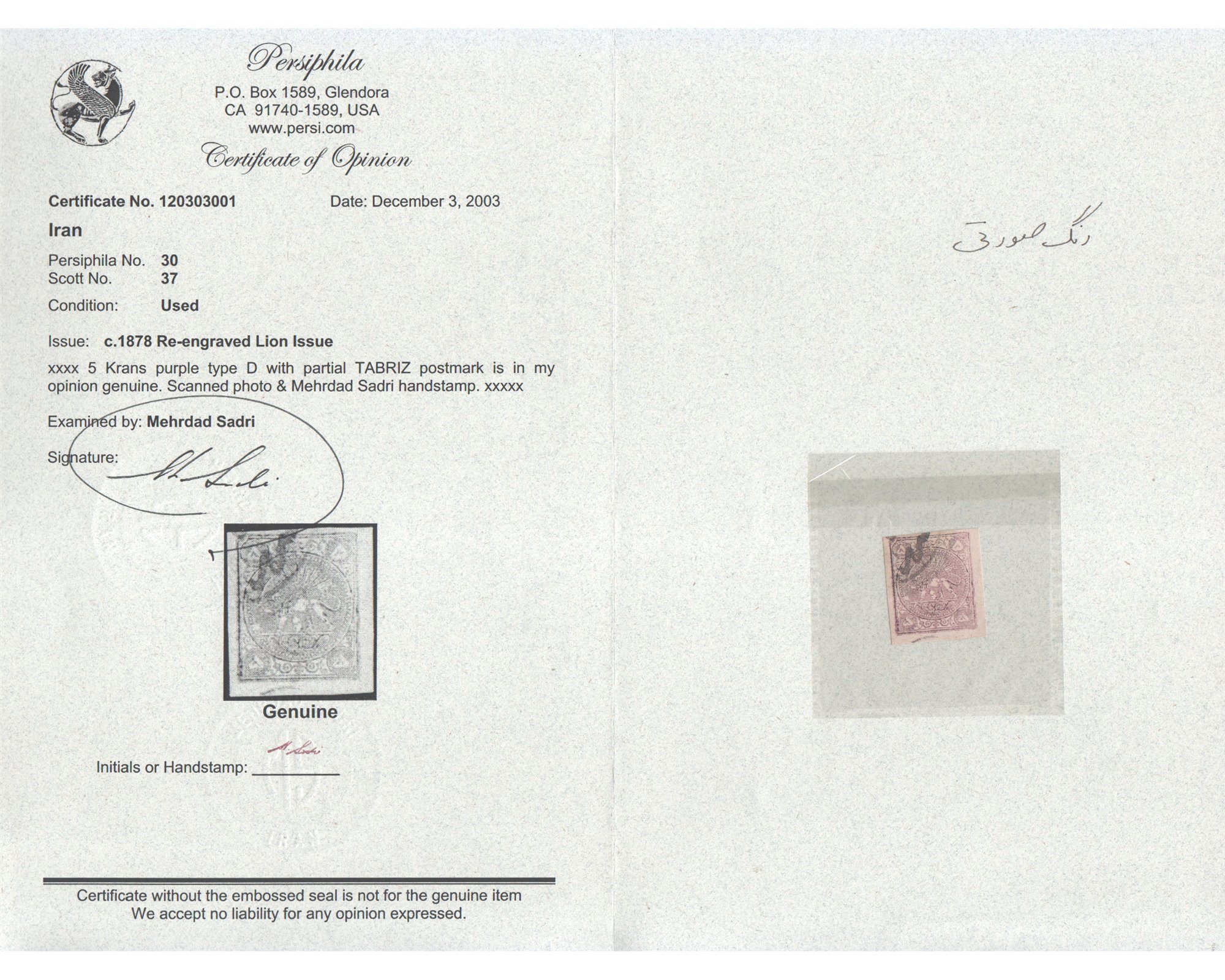 1878 5 Kran Purple Type D Certificate By Mr. Sadri