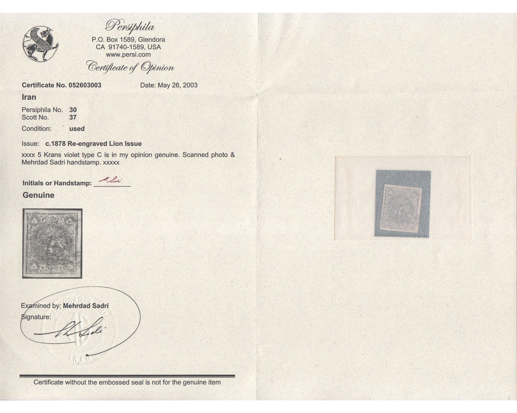 1878 5 Kran Purple Type C Certificate By Mr. Sadri