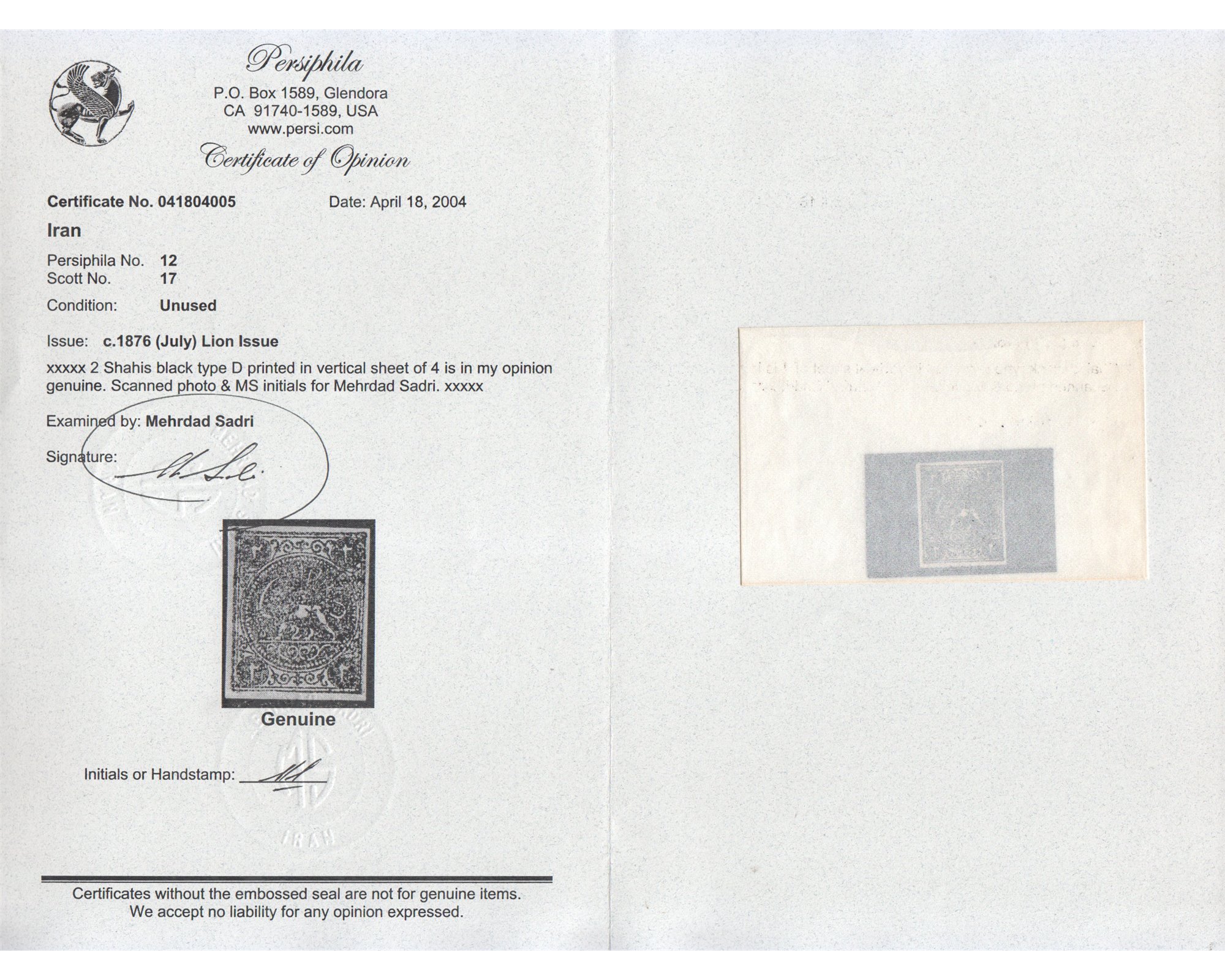 سال ۱۲۵۵ـ ۲ شاهی سیاه چاپ غمودی با گواهی آقای صدریکیفیت: بی باطلFarahbakhsh N° 24; Persiphila 12