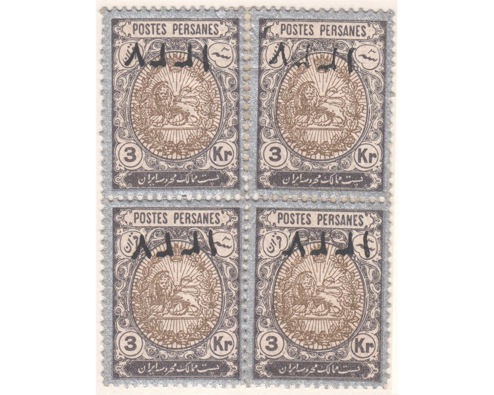 IPSC تمبر۳ قران مشروطه با رو چاپ وارو ۱۳۳۷ بلوک ۴ تایی با سرتیفیکیت