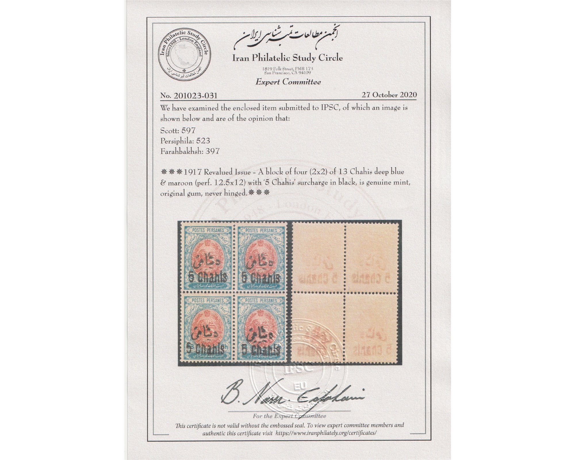 Condition: Mint Never Hinged Certificate By IPSC بدون اثر شارنیهبرای دیدن با بهترین کیفیت ماوس کامپیوتر را روی تصویر تکان دهید