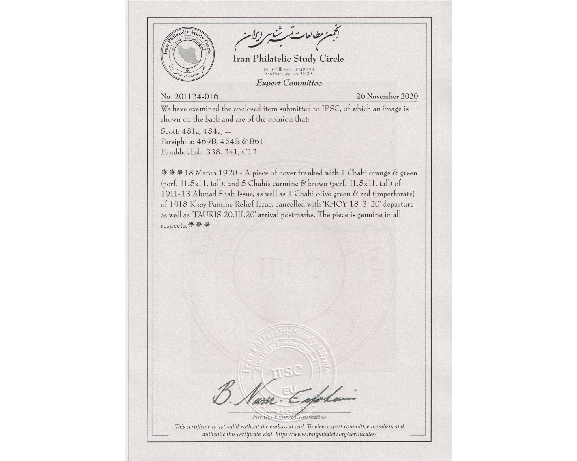 1918 Khoy Famine Relief on Piece Certificate By IPSC در روی قطعه پاکتبرای دیدن با بهترین کیفیت ماوس کامپیوتر را روی تصویر تکان دهید