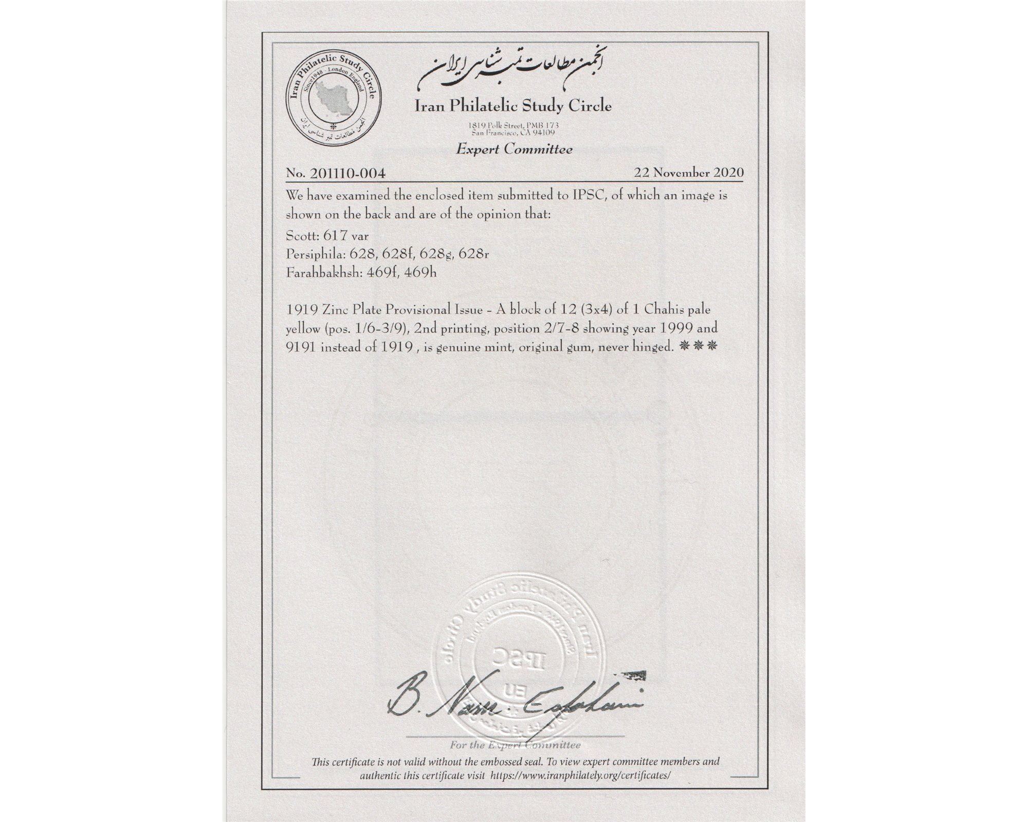 Condition: Mint Never Hinged Certificate By IPSC بدون اثر شارنیهبرای دیدن با بهترین کیفیت ماوس کامپیوتر را روی تصویر تکان دهید