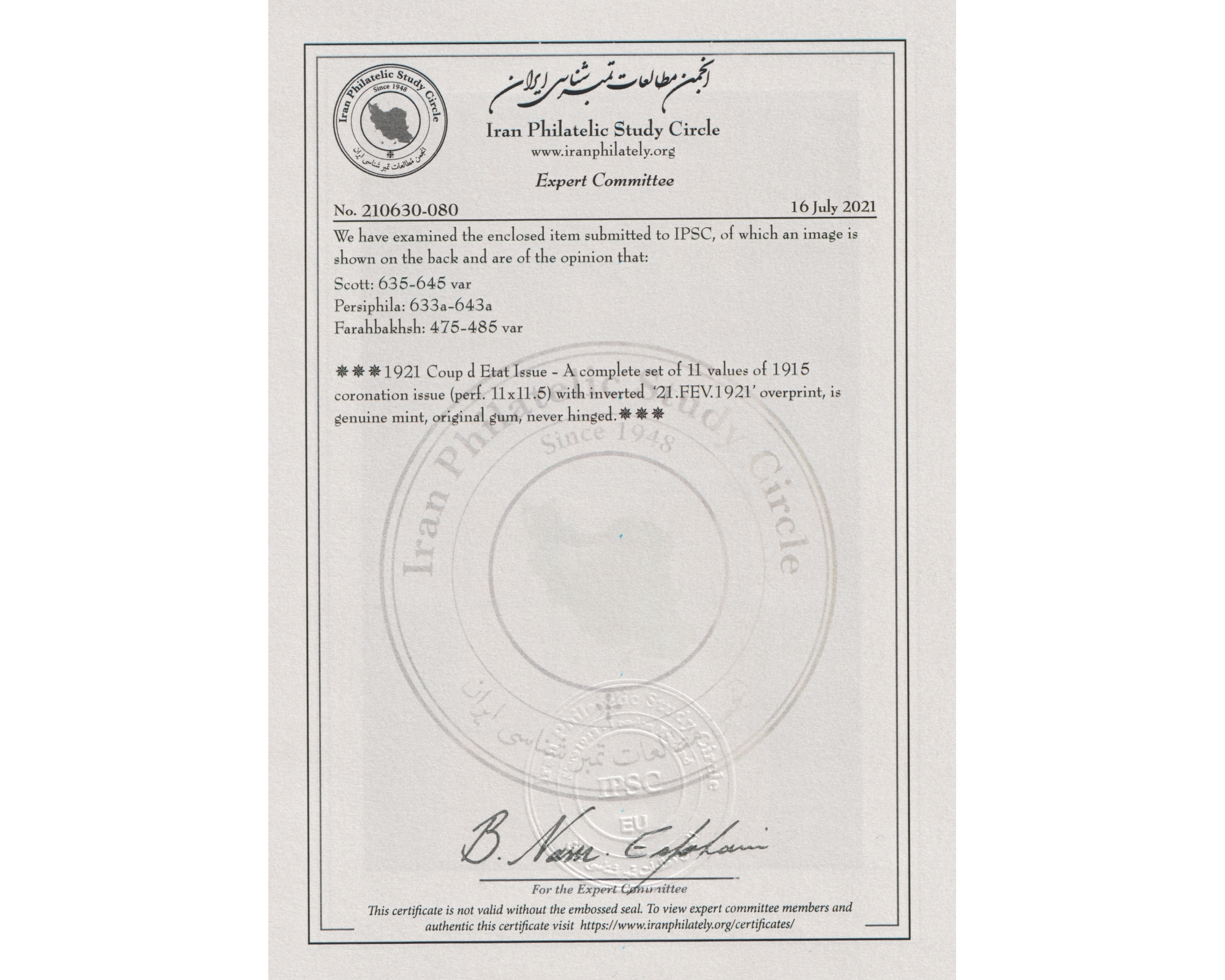 1921 The Coup d'Etat Issue Certificate By IPSC With Inverted Overprint Condition: Mint Never Hinged برای دیدن با بهترین کیفیت ماوس کامپیوتر را روی تصویر تکان دهید