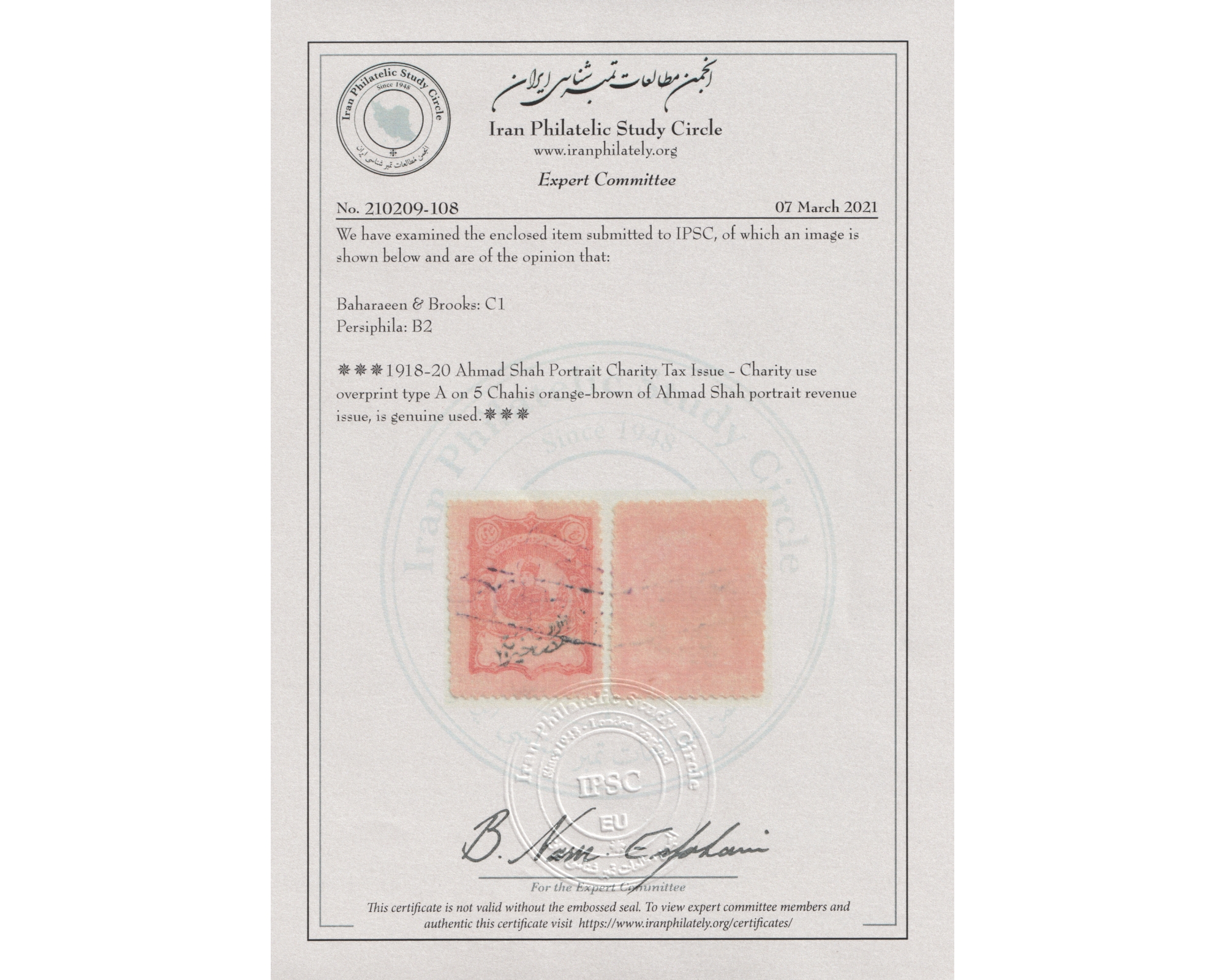 تمبر پنج شاهی مصارف خیریه با پرتره احمد شاه