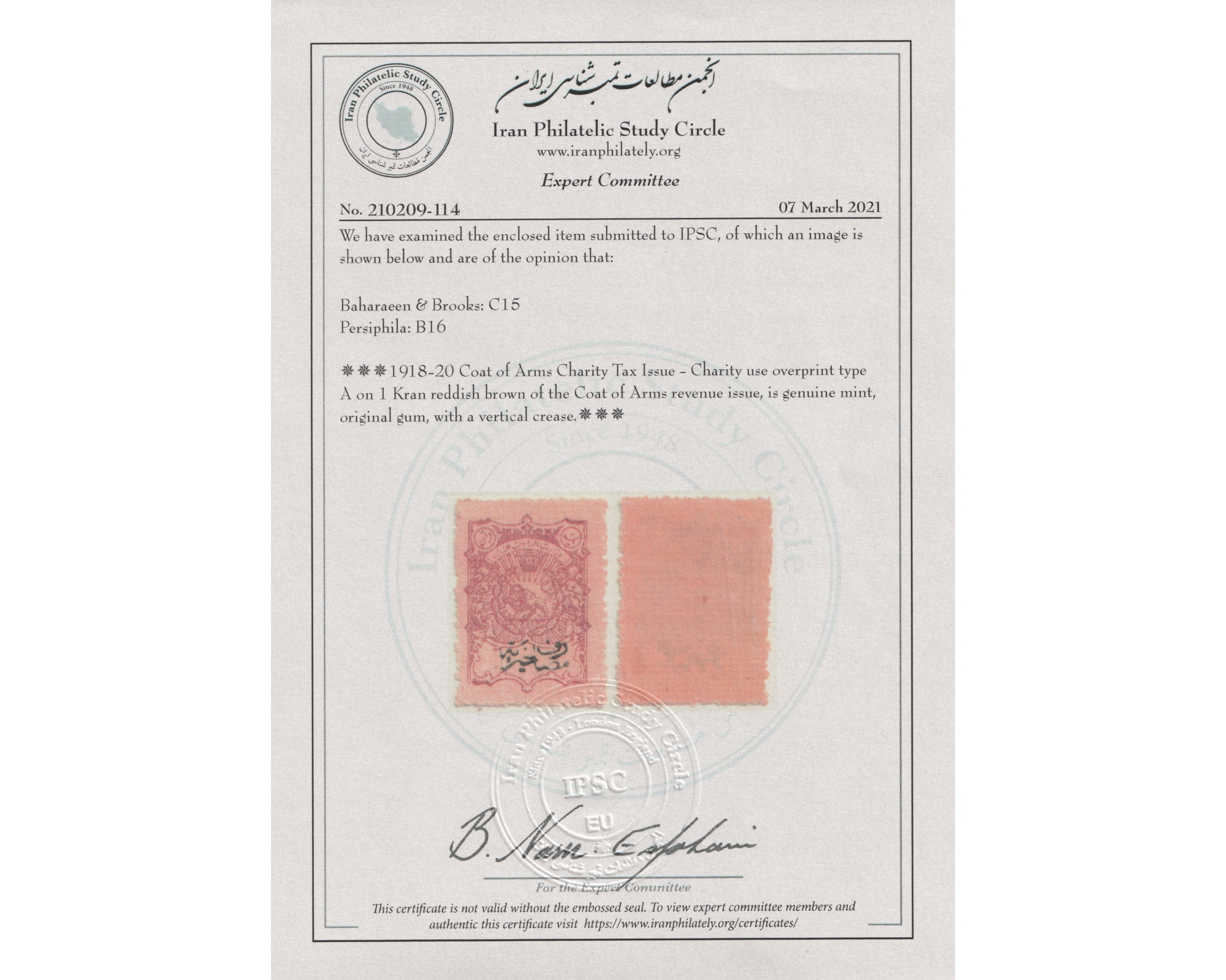Certificate By IPSCCondition; Mint Original Gum Lightly Hingedاستفاده نشده با چسب اصلی و اثر ضعیف شارنیهبرای دیدن با بهترین کیفیت ماوس کامپیوتر را روی تصویر تکان دهید