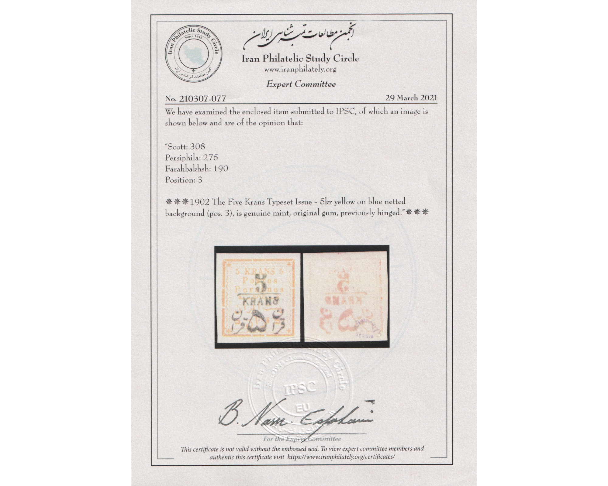 Certificate By IPSCHandstamped By Dr. DadkhahCondition; Mint Lightly Hinged با اثر ضعیف شارنیهبرای دیدن با بهترین کیفیت ماوس کامپیوتر را روی تصویر تکان دهید