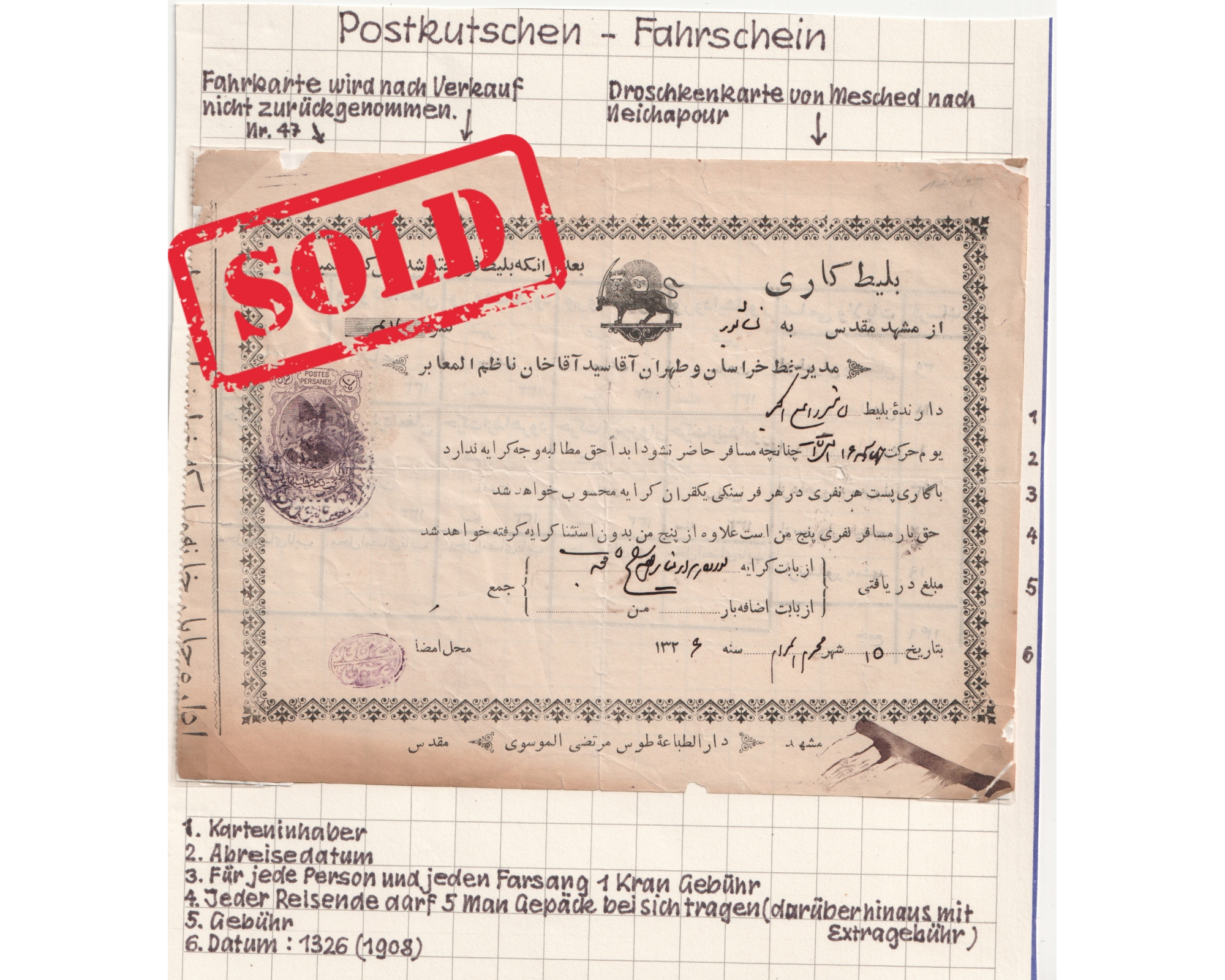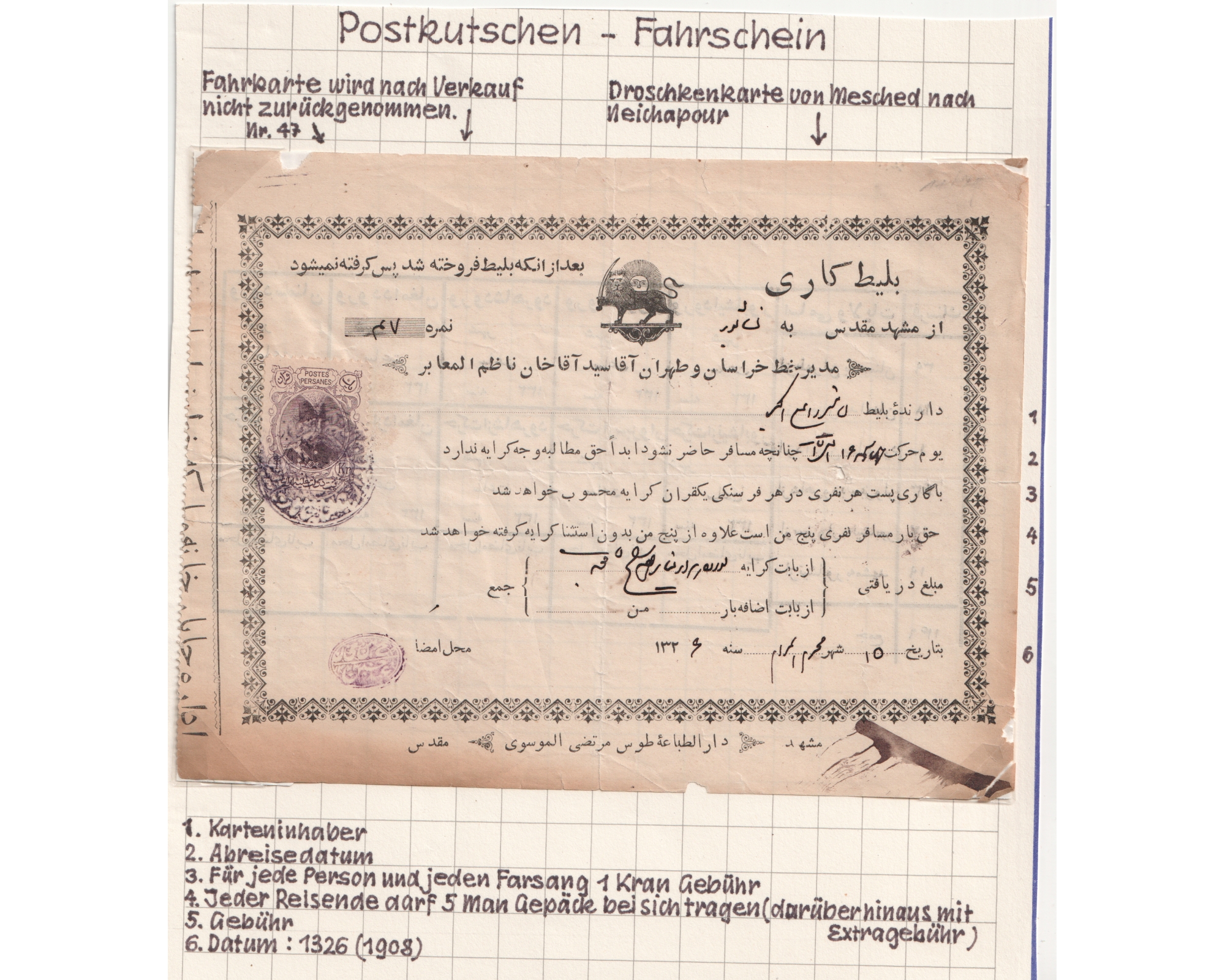 1908 Tehran - Khorasan stagecoach Document