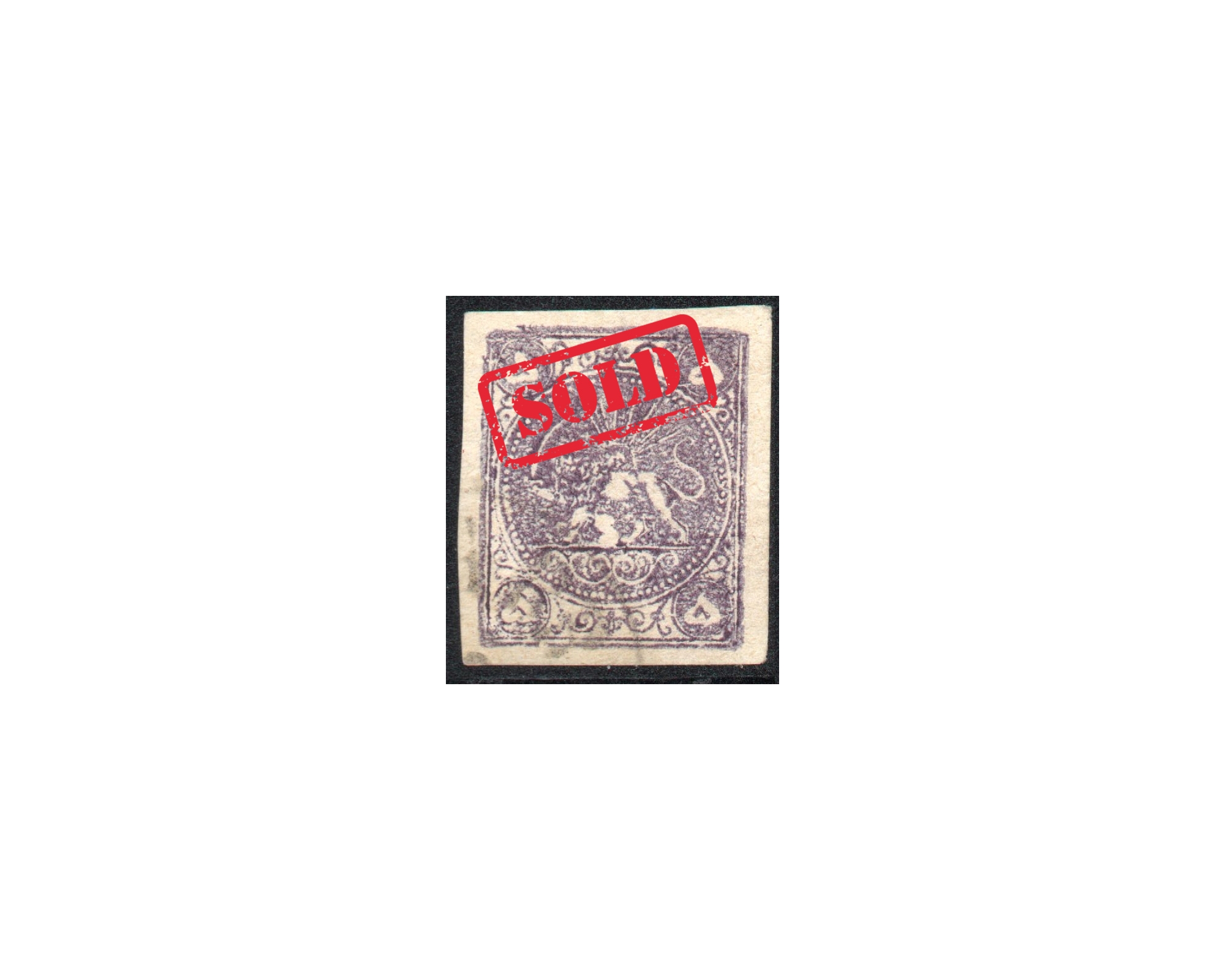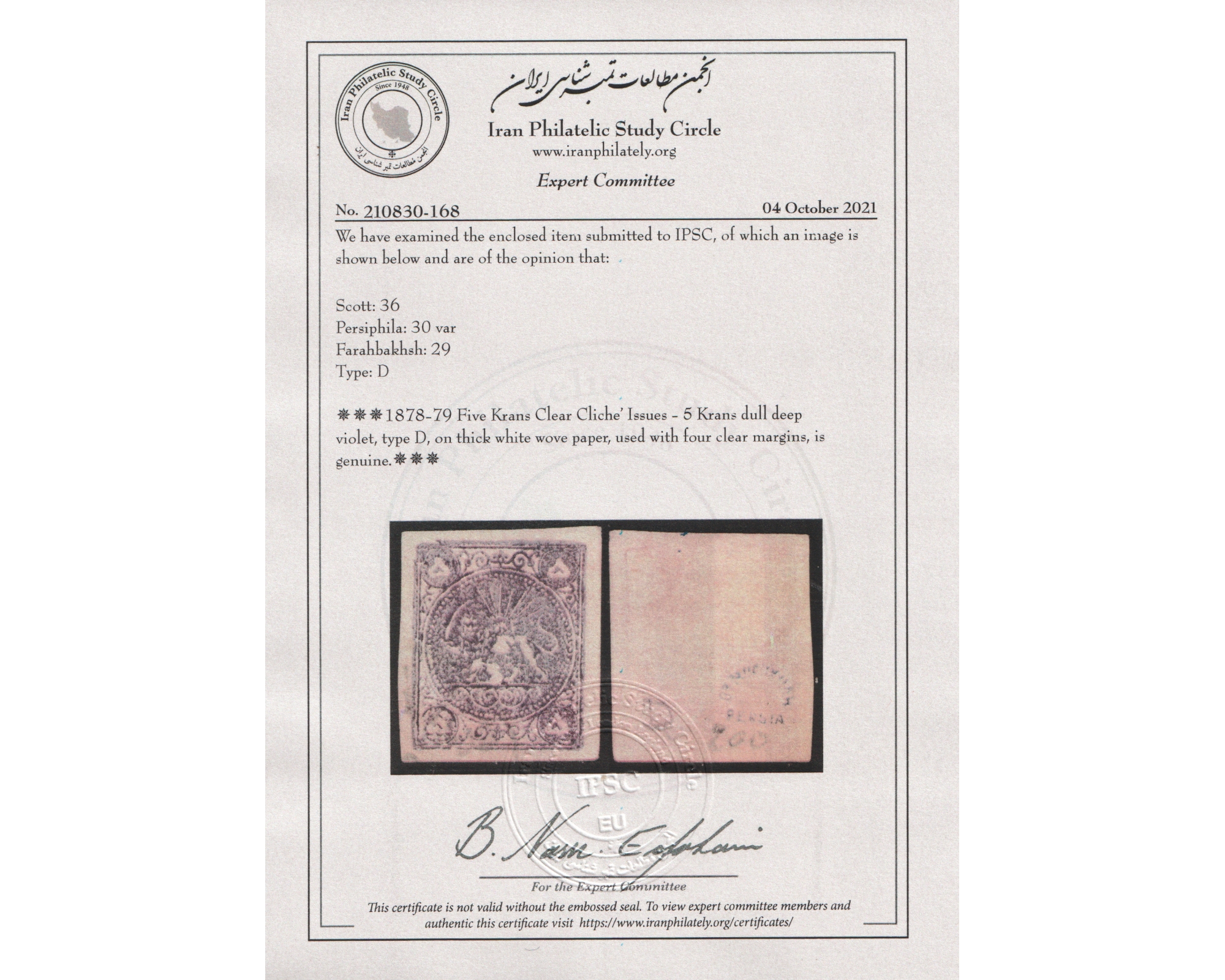 1878-79 Five Krans Clear Cliche' Issues - 5 Krans dull deep violet, type D, on thick white wove paper, used with four clear margins. Certificate by IPSC and Signed by Dr. Dadkhah