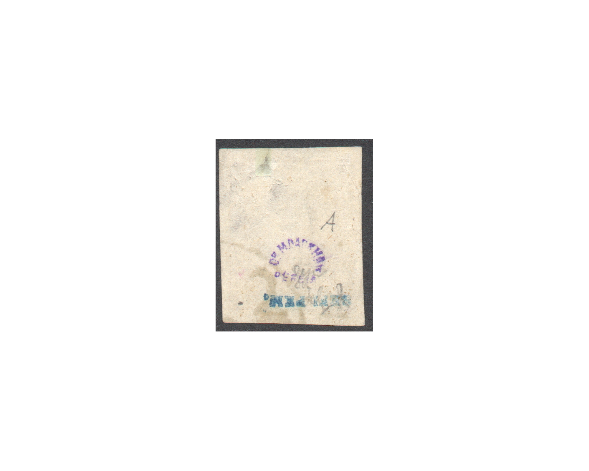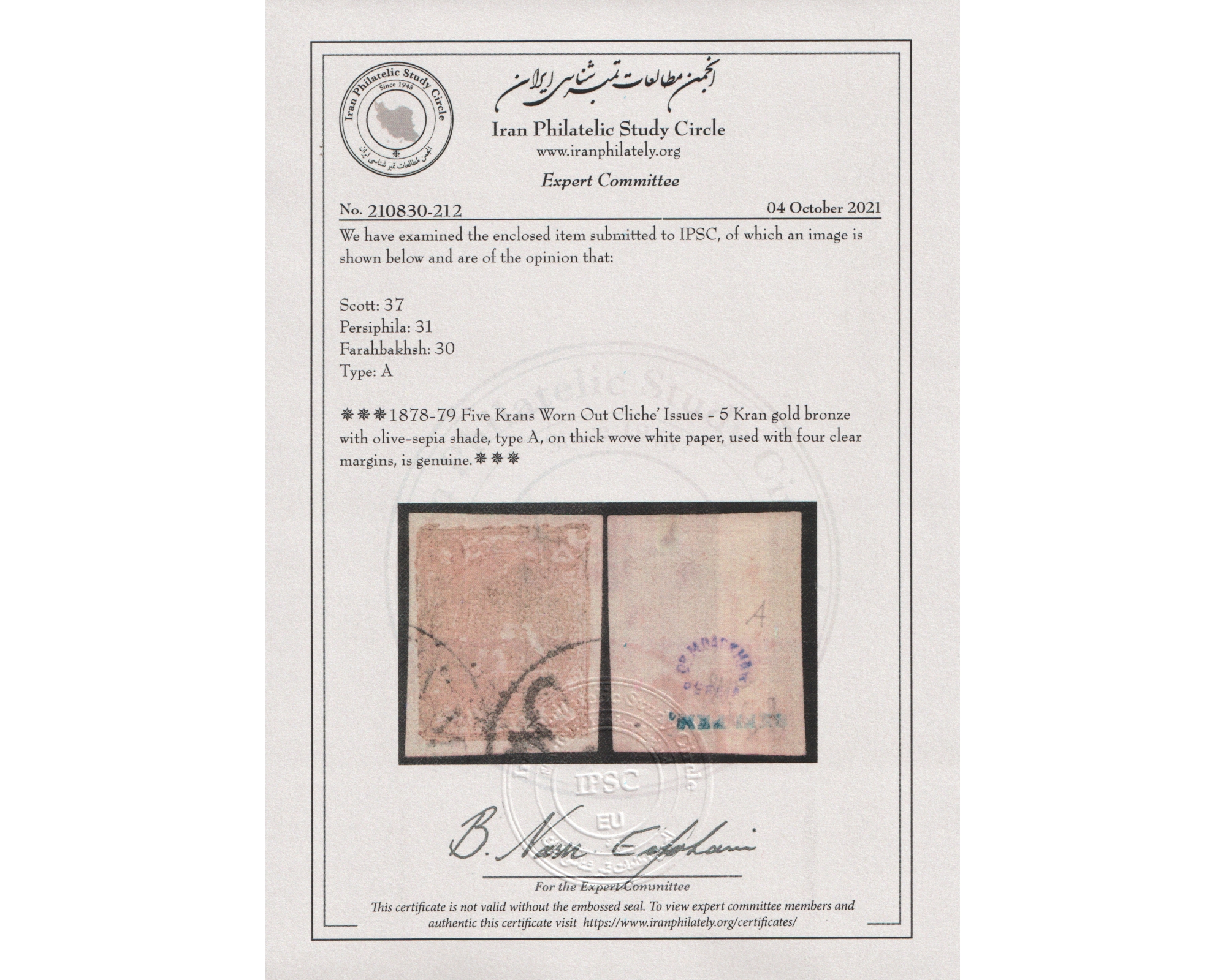 1878-79 Five Krans Worn Out Cliche' Issues - 5 Kran gold bronze with olive-sepia shade, type A, on thick wove white paper, used with four clear margins.