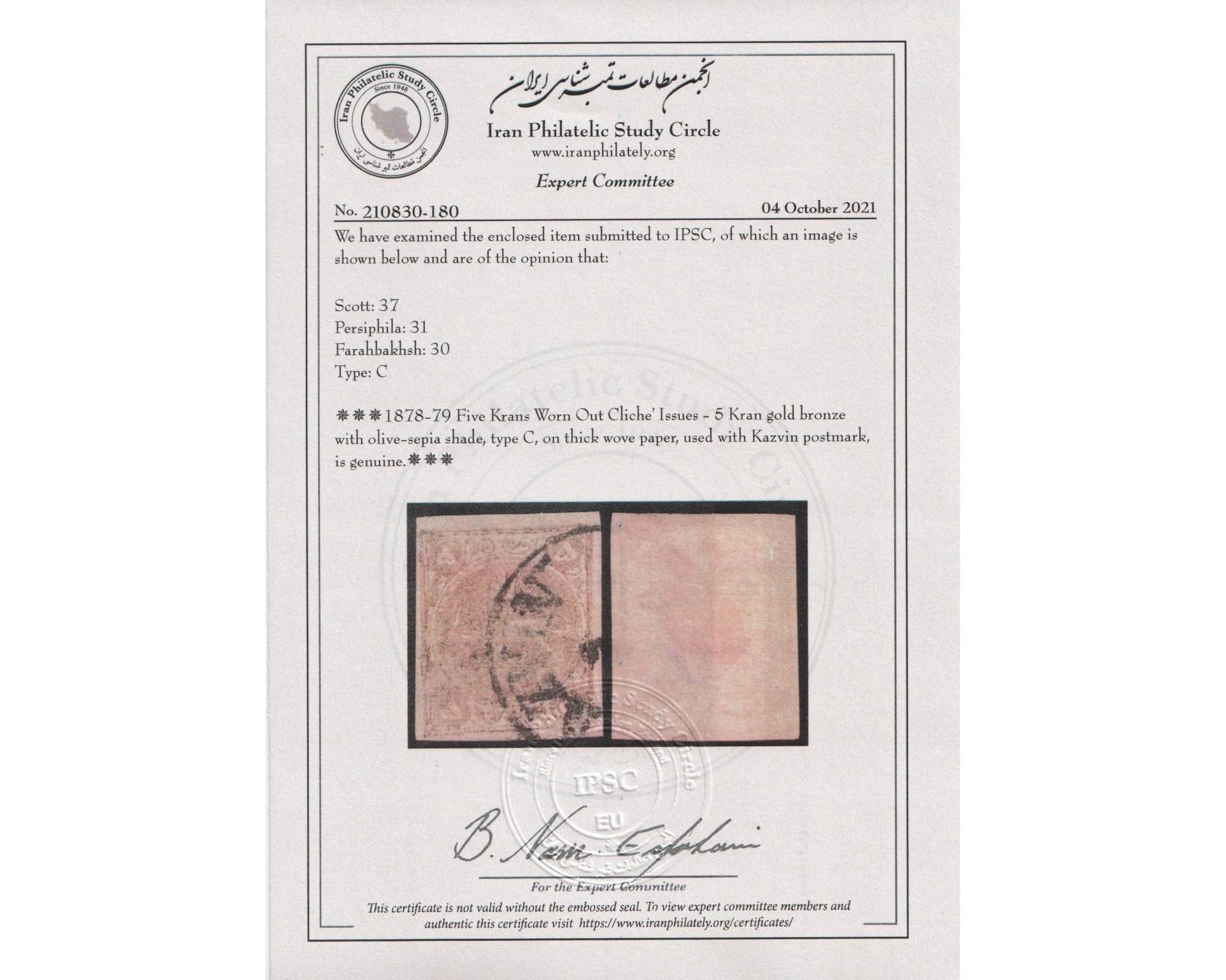 1878-79 Five Krans Worn Out Cliche' Issues - 5 Kran gold bronze with olive-sepia shade, type C, on thick wove paper, used with Kazvin postmark. Certificate by IPSC