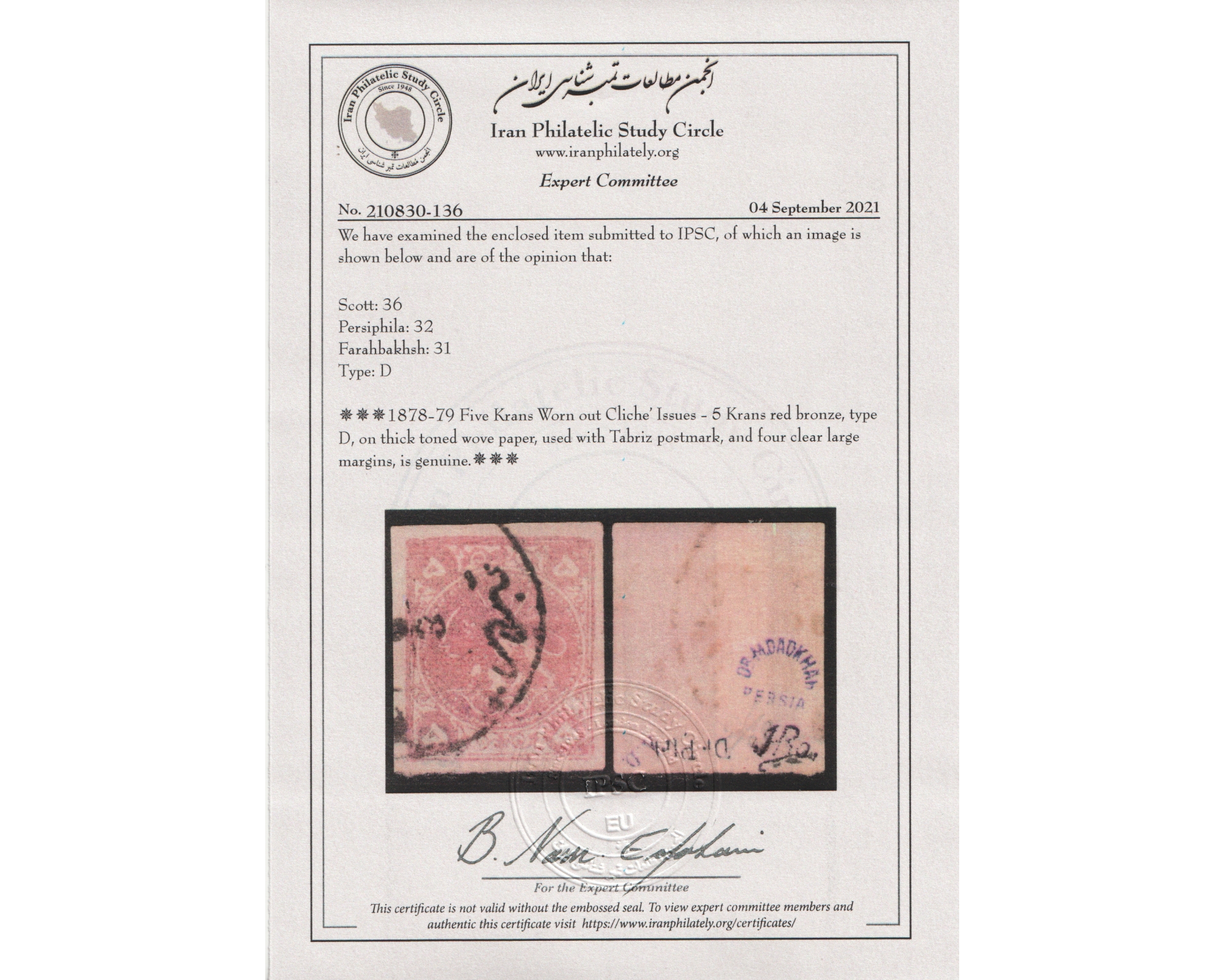 1878-79 Five Krans Worn out Cliche' Issues - 5 Krans red bronze, type D, on thick toned wove paper, used with Tabriz postmark, and four clear large margins. Certificate by IPSC