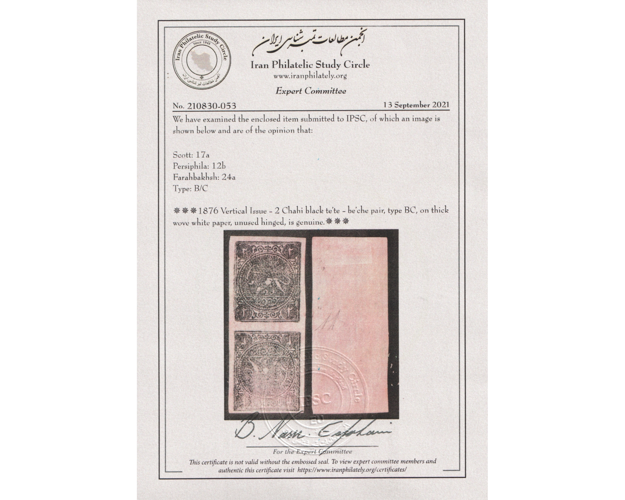 1876 Vertical Issue - 2 Chahi black te'te - be'che pair, type BC, on thick wove white paper, unused hinged.Certificate by IPSCبرای دیدن با بهترین کیفیت ماوس کامپیوتر را روی تصویر تکان دهید