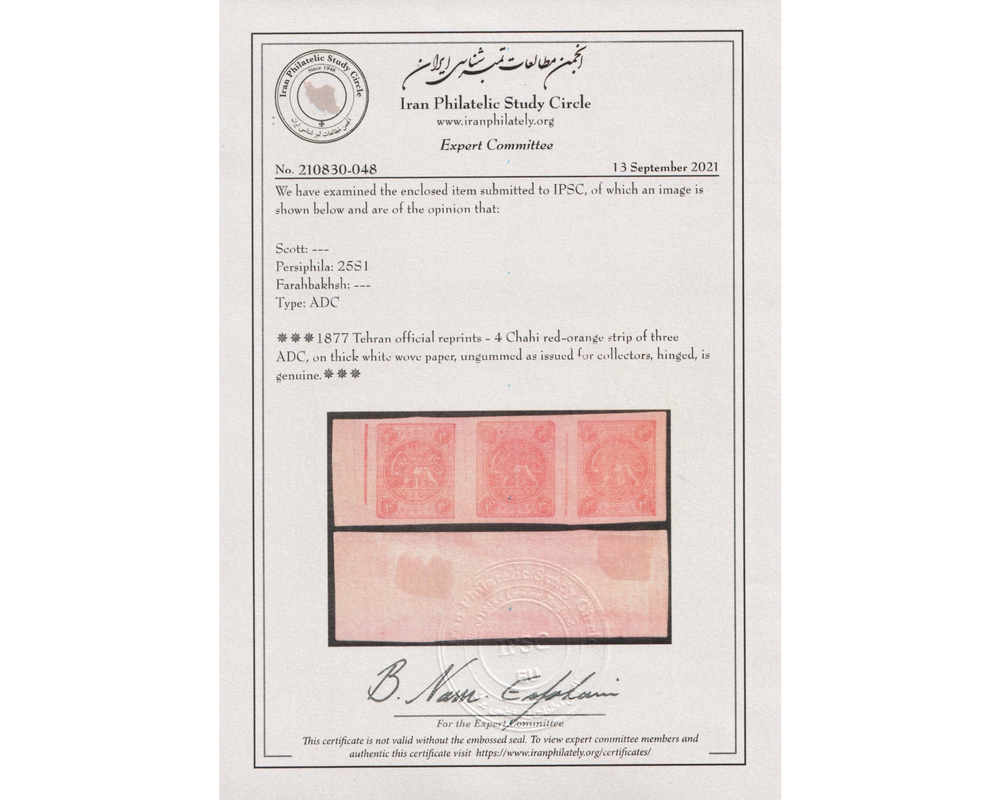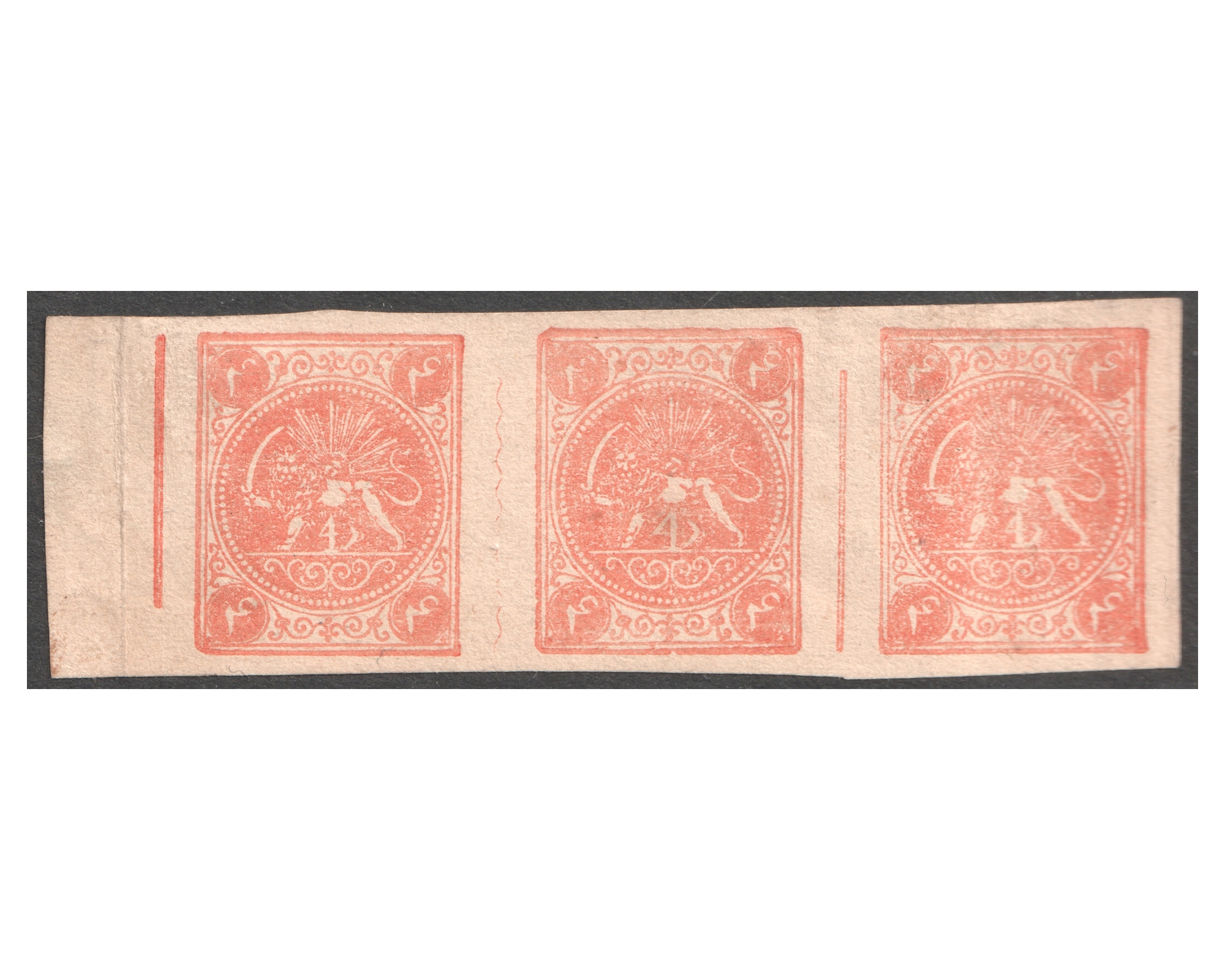 1877 Tehran official reprints - 4 Chahi red-orange strip of three ADC, on thick white wove paper, ungummed as issued for collectors. Certificate by IPSC