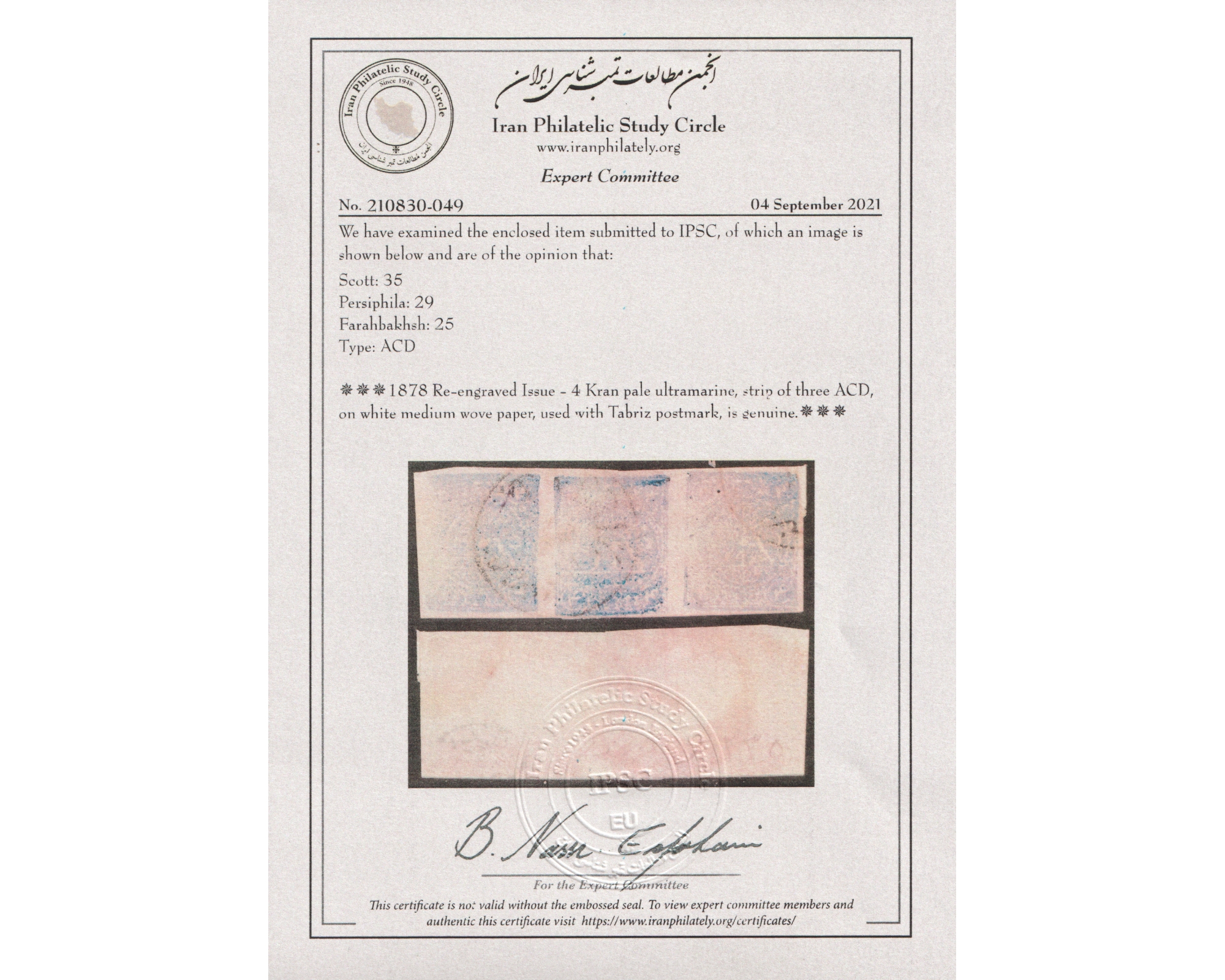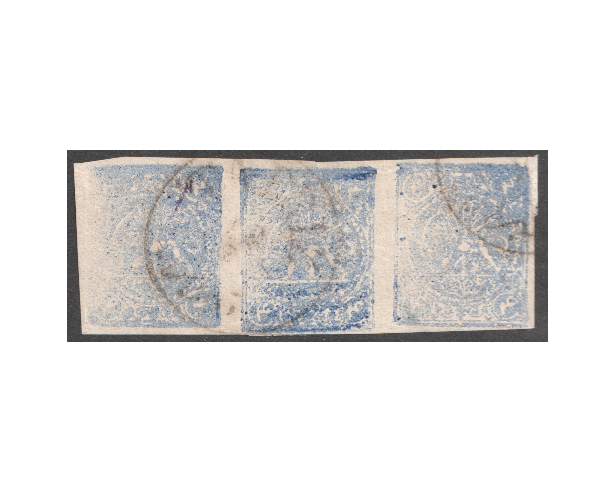 1878 Re-engraved Issue - 4 Kran pale ultramarine, strip of three ACD, on white medium wove paper, used with Tabriz postmark.Certificate by IPSCبرای دیدن با بهترین کیفیت ماوس کامپیوتر را روی تصویر تکان دهید