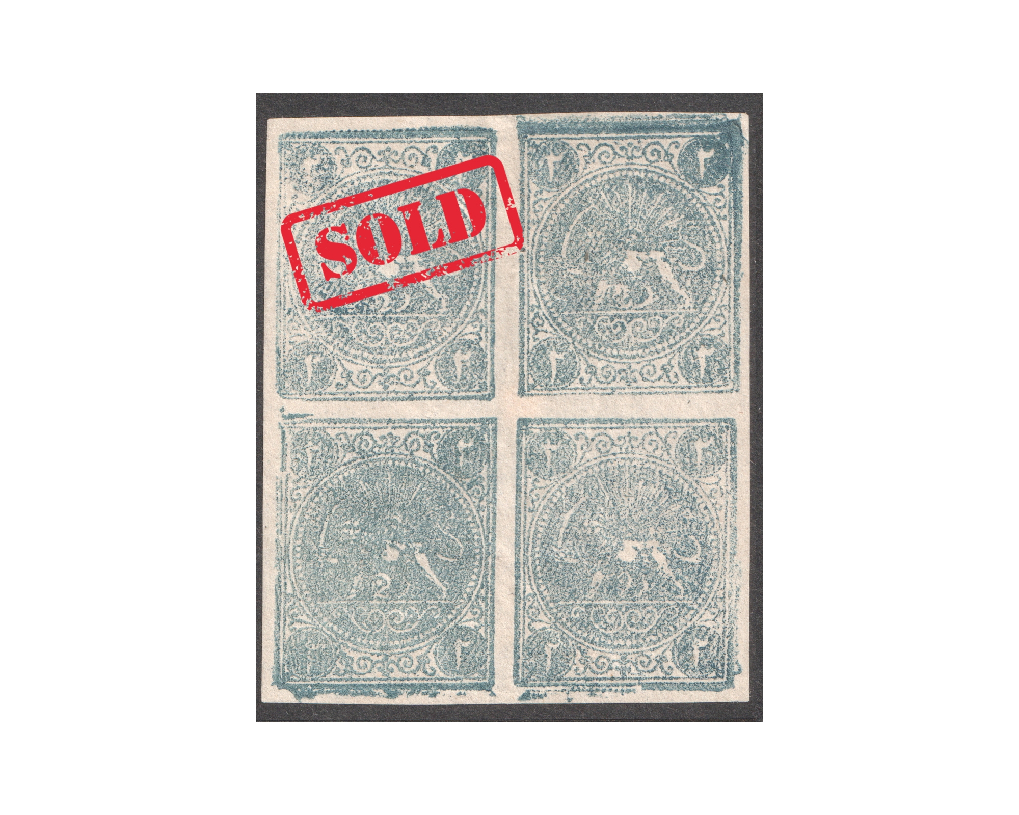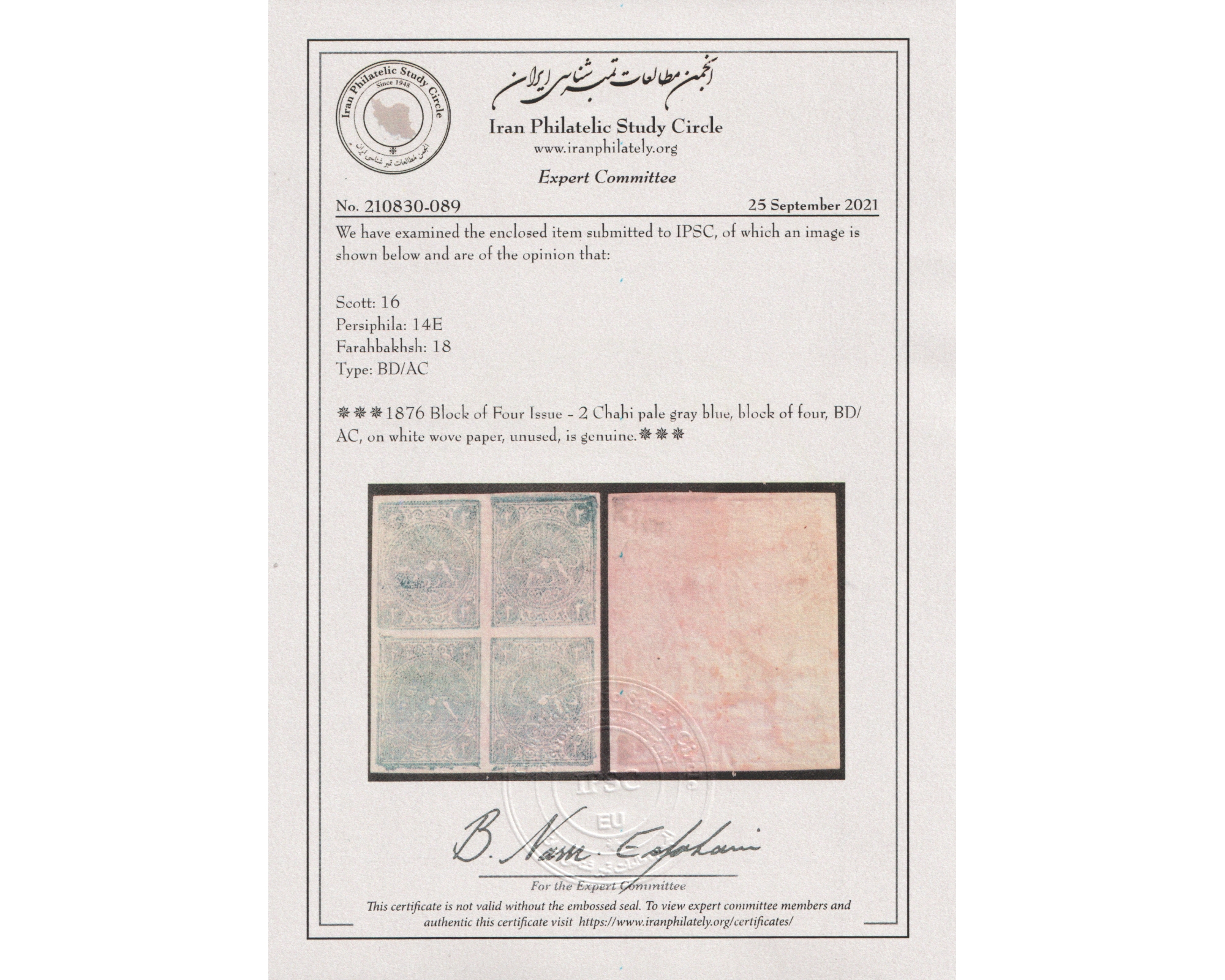 1876 Block of Four Issue - 2 Chahi pale gray blue, block of four, BD/AC, on white wove paper, unused.Certificate by IPSCبرای دیدن با بهترین کیفیت ماوس کامپیوتر را روی تصویر تکان دهید