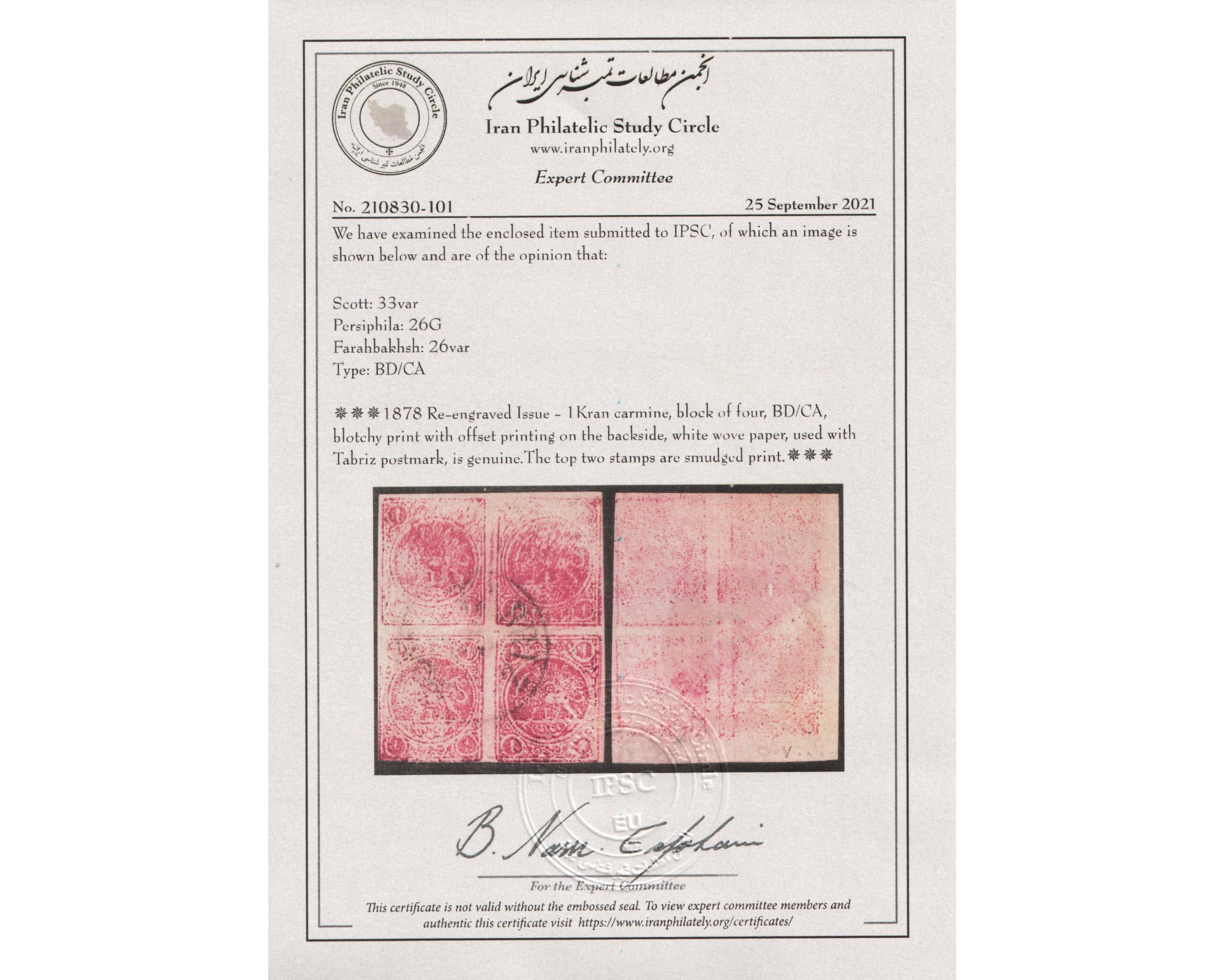 1878 Re-engraved Issue - 1Kran carmine, block of four, BD/CA, blotchy print with offset printing on the backside, white wove paper, used with Tabriz postmark.