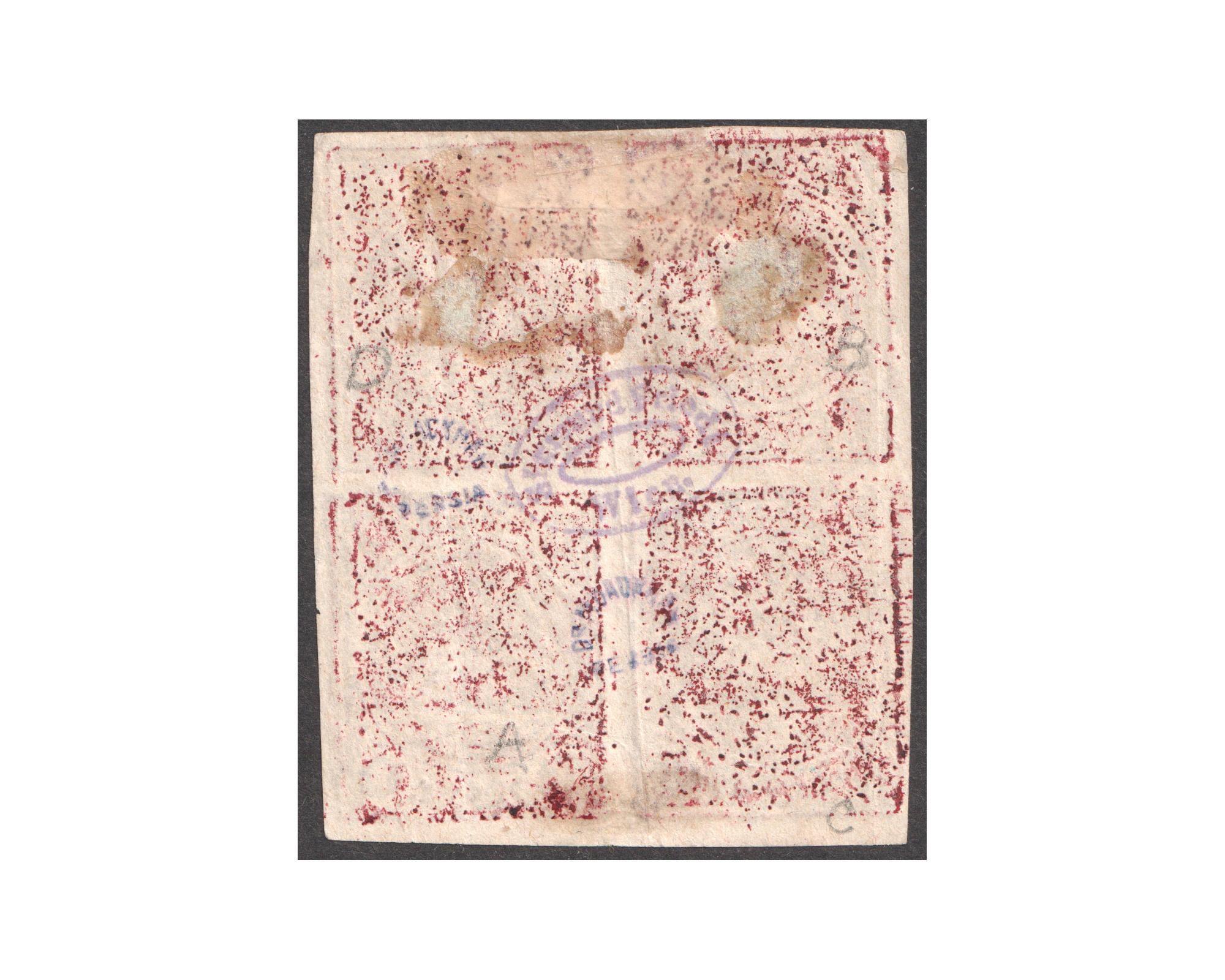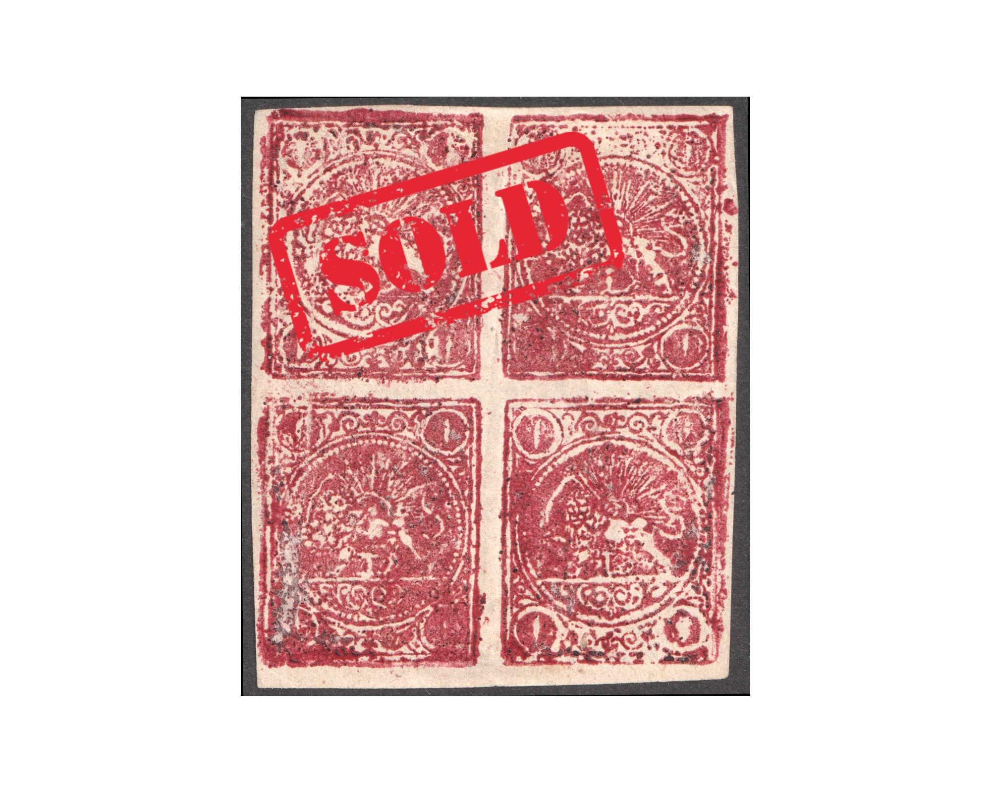 1878 Re-engraved Issue - 1 Kran crimson, block of four, BD/CA, offset printing on the backside, on white wove paper, unused.Certificate by IPSCبرای دیدن با بهترین کیفیت ماوس کامپیوتر را روی تصویر تکان دهید