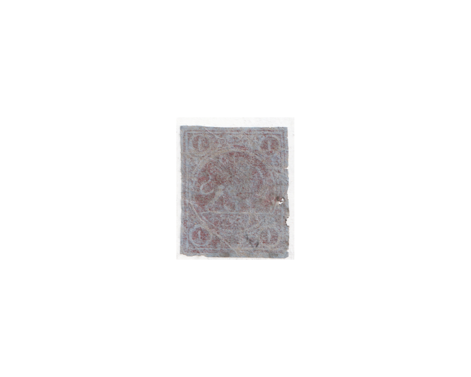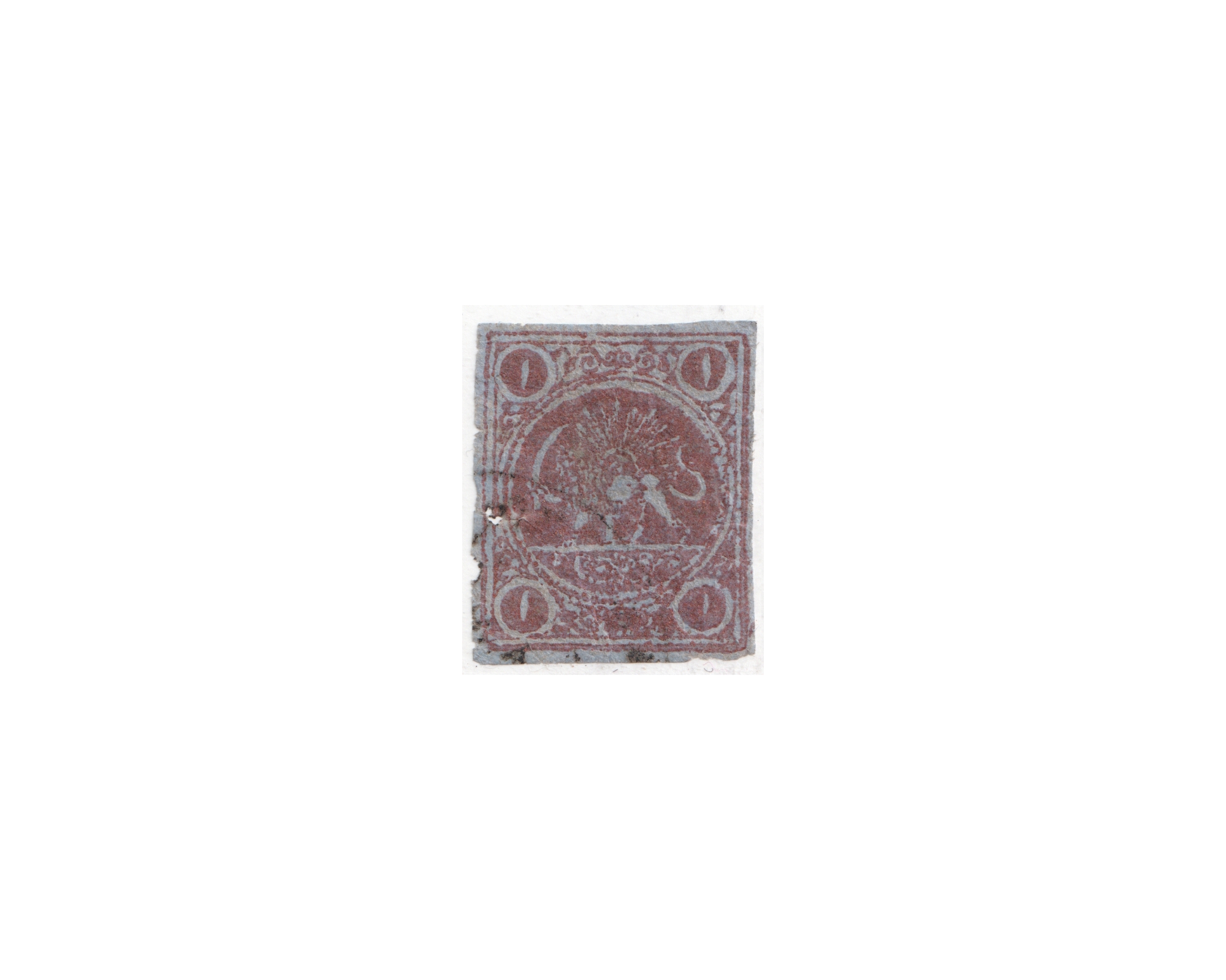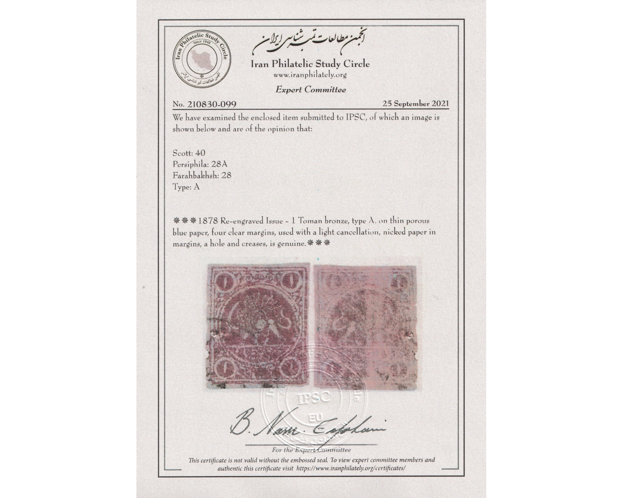 1878 Re-engraved Issue - 1 Toman bronze, type A, on thin porous blue paper, four clear margins, used with a light cancellation, nicked paper in margins, a hole and creases. Certificate by IPSC
