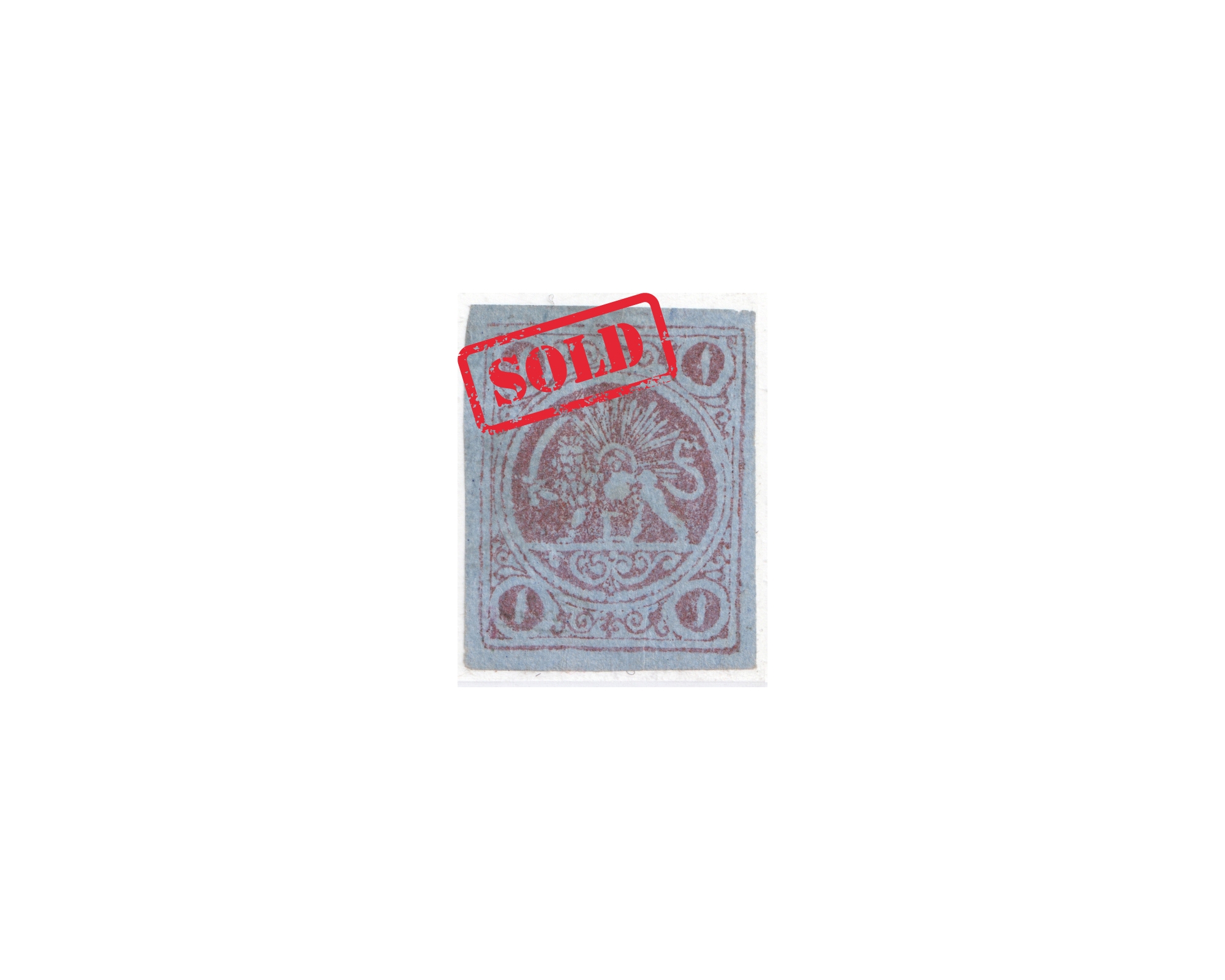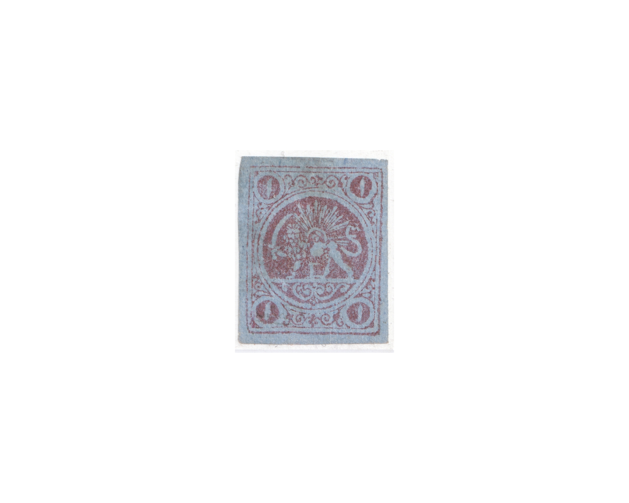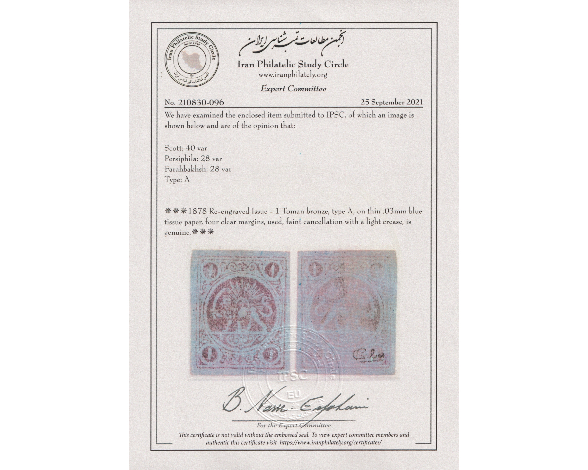 1878 Re-engraved Issue - 1 Toman bronze, type A, on thin .03mm blue tissue paper, four clear margins, used, faint cancellation with a light crease,. Certificate by IPSC