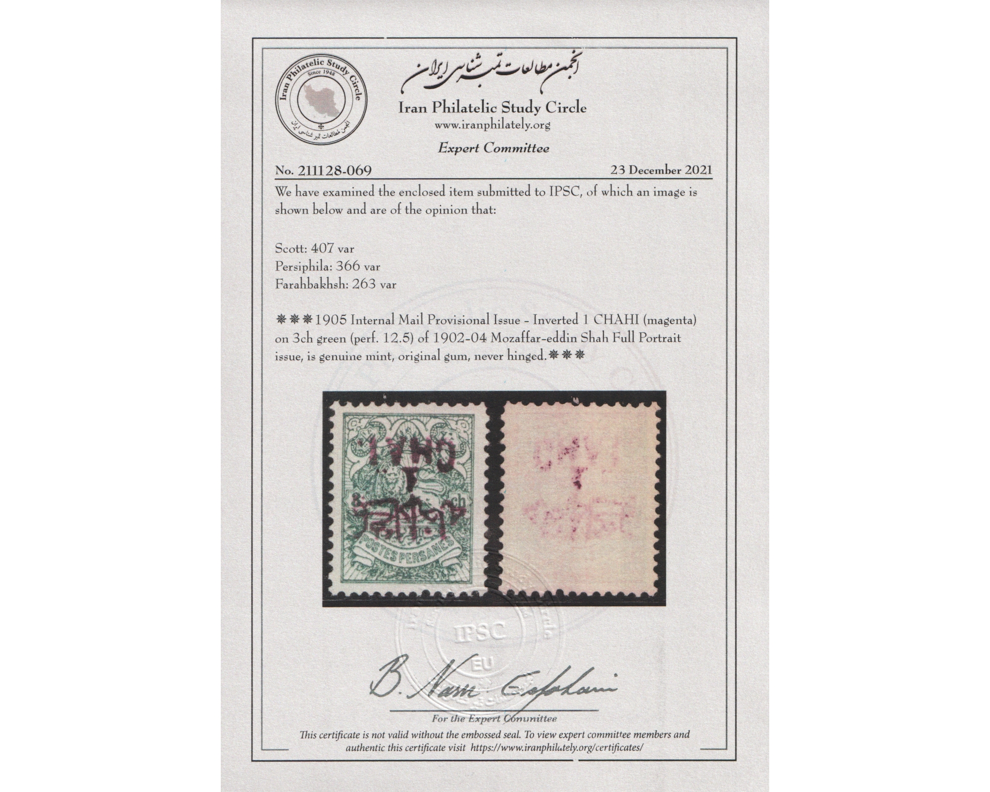 Condition: Mint Never HingedCertificate By IPSC بدون اثر شارنیهبرای دیدن با بهترین کیفیت ماوس کامپیوتر را روی تصویر تکان دهید