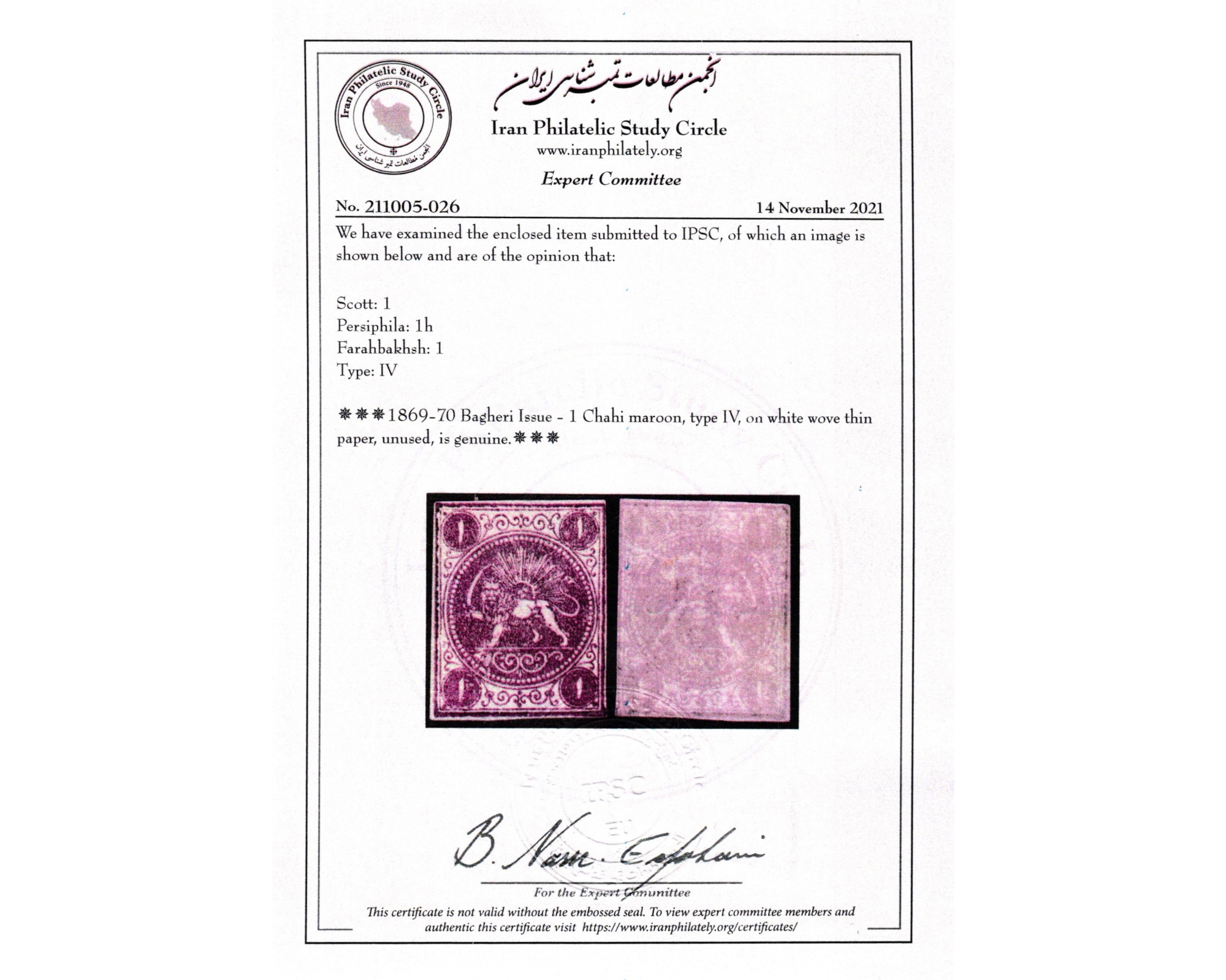 1870 1ch Bagheri Thin Paper Certificate By IPSC