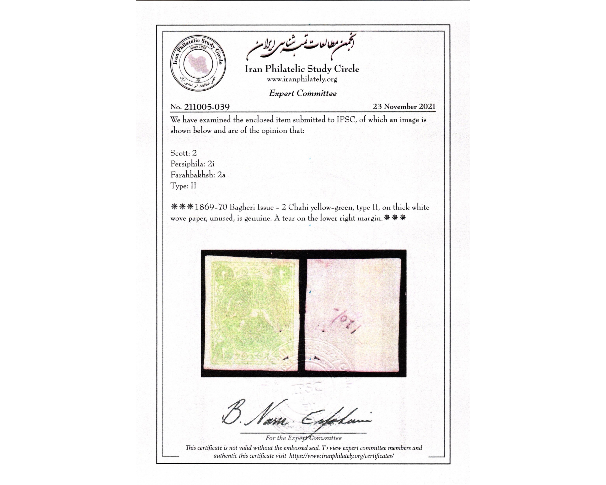 1870 2ch Bagheri Thick Paper VerietyType IIThe Stamp has a Tear and CreaseCertificate by IPSCبرای دیدن با بهترین کیفیت ماوس کامپیوتر را روی تصویر تکان دهید