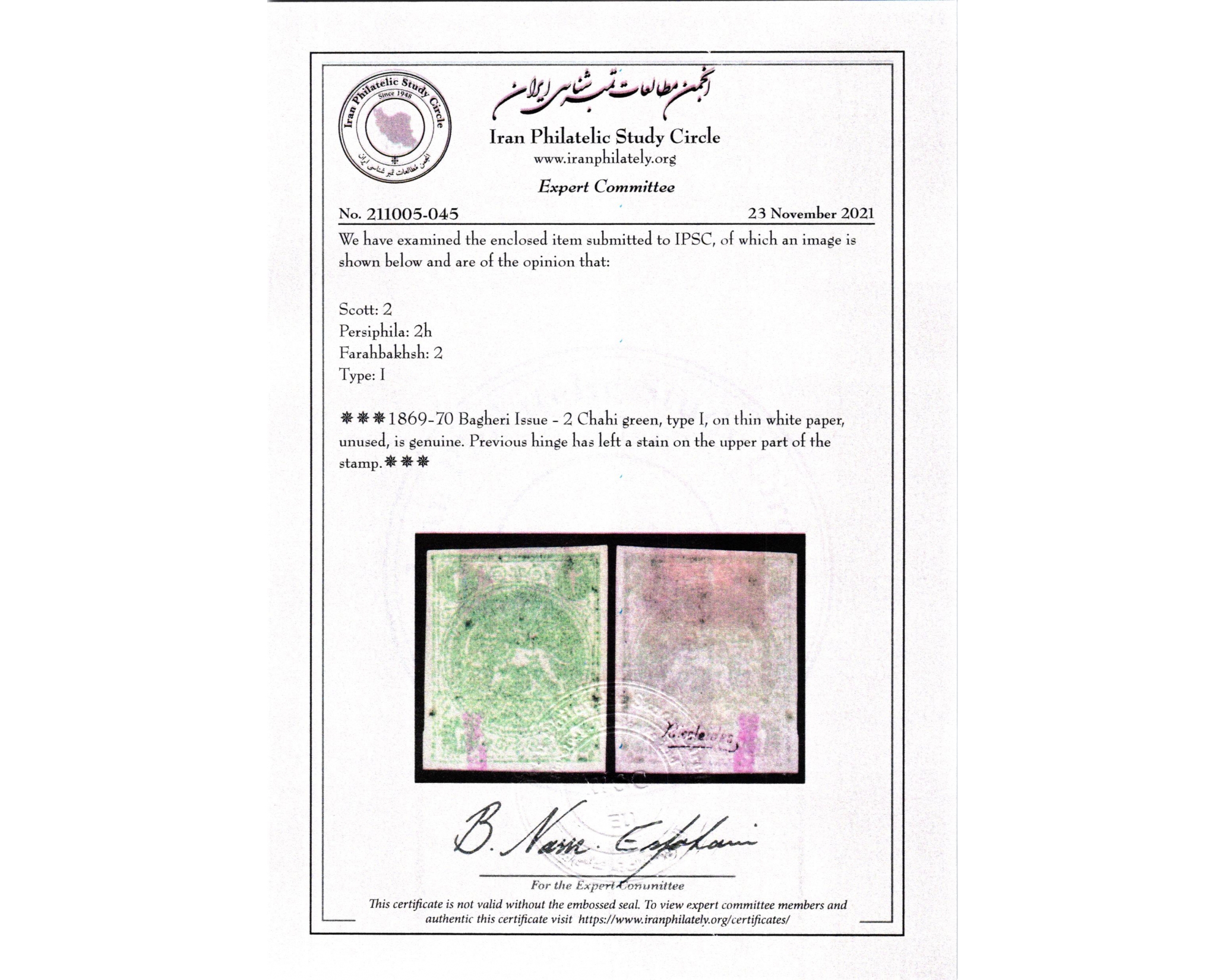 1870 2ch Bagheri Thin Paper Certificate By IPSC