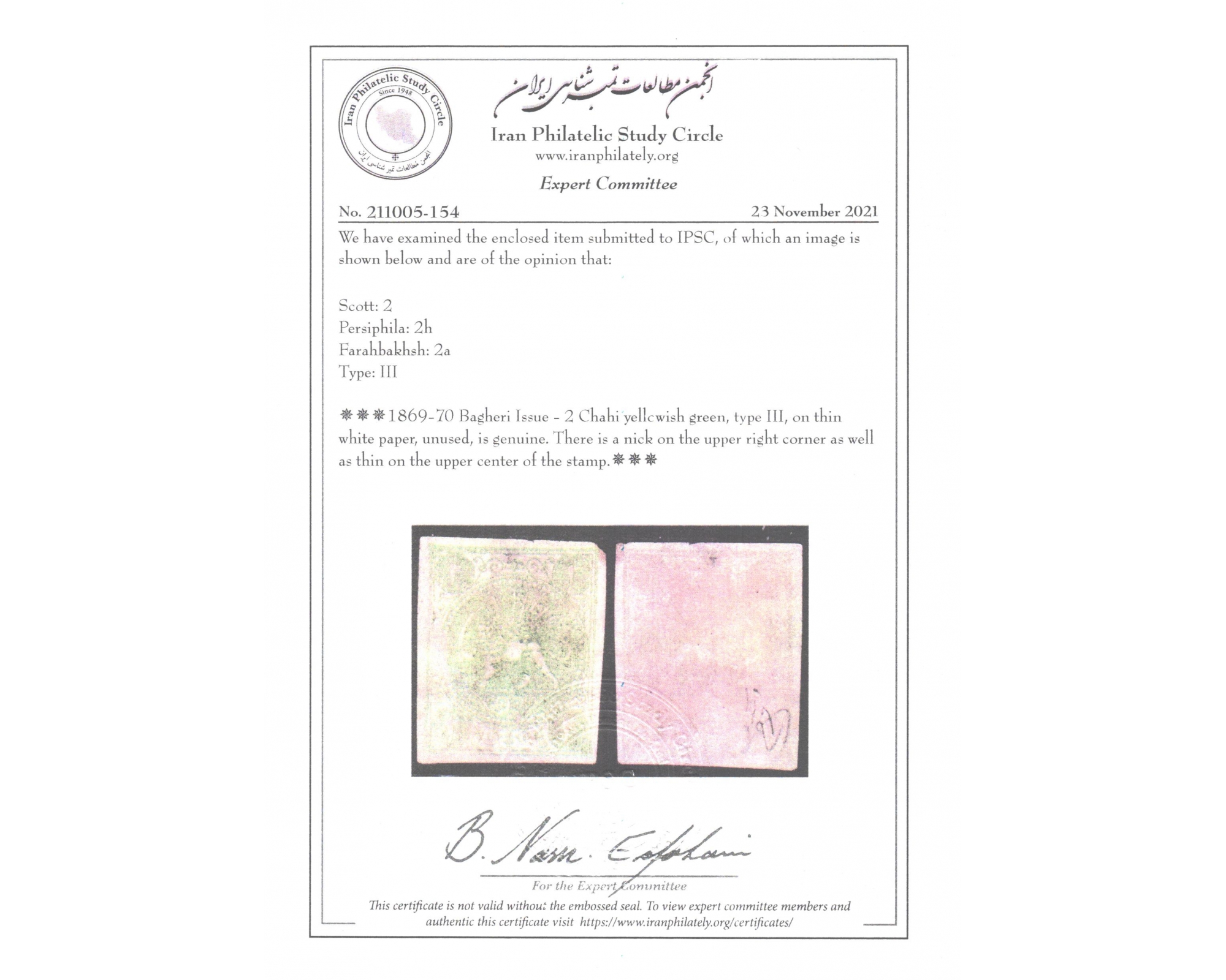 1870 2ch Bagheri Thin Paper Certificate By IPSC