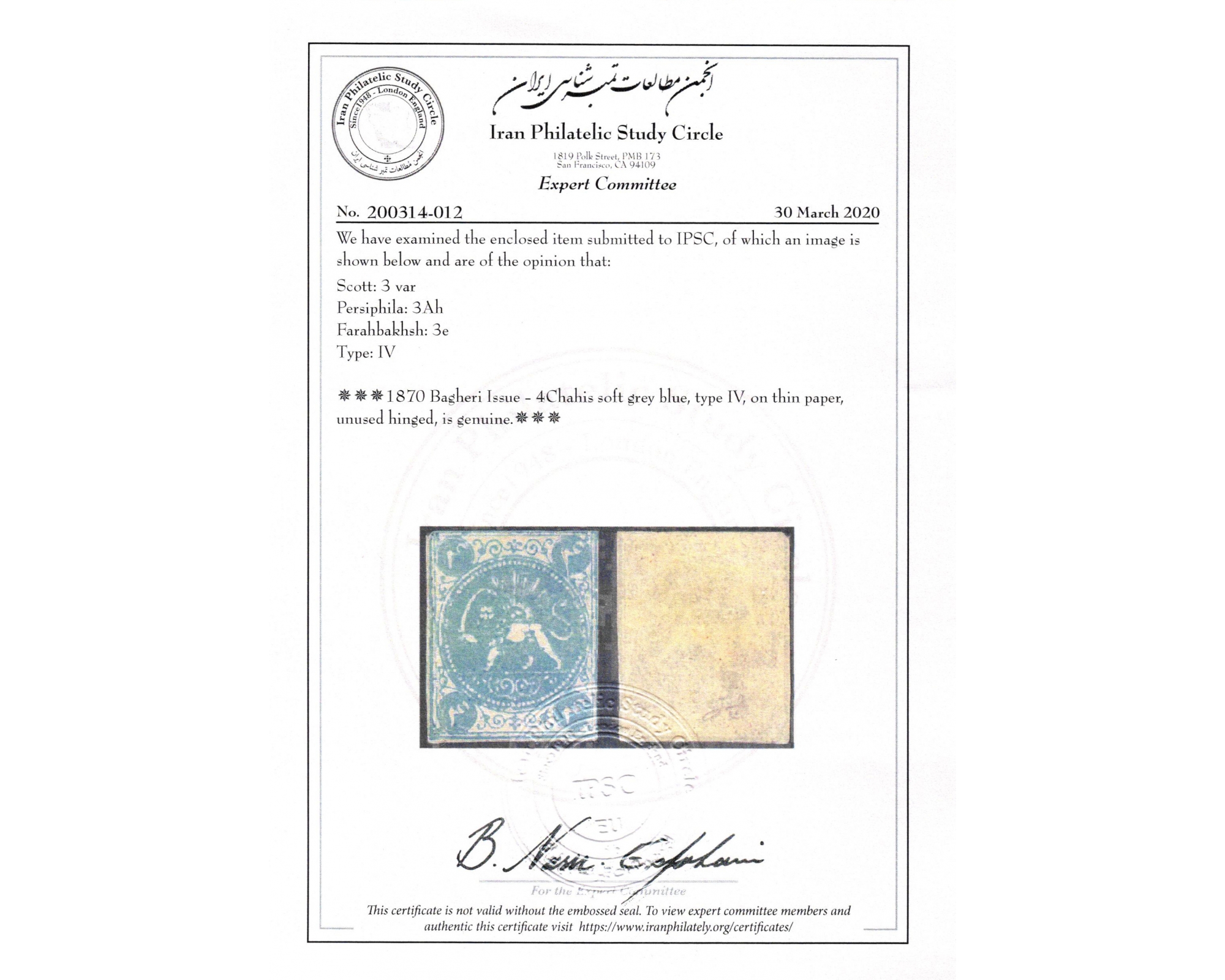 1870 4ch Bagheri Thin Paper Certificate By IPSC