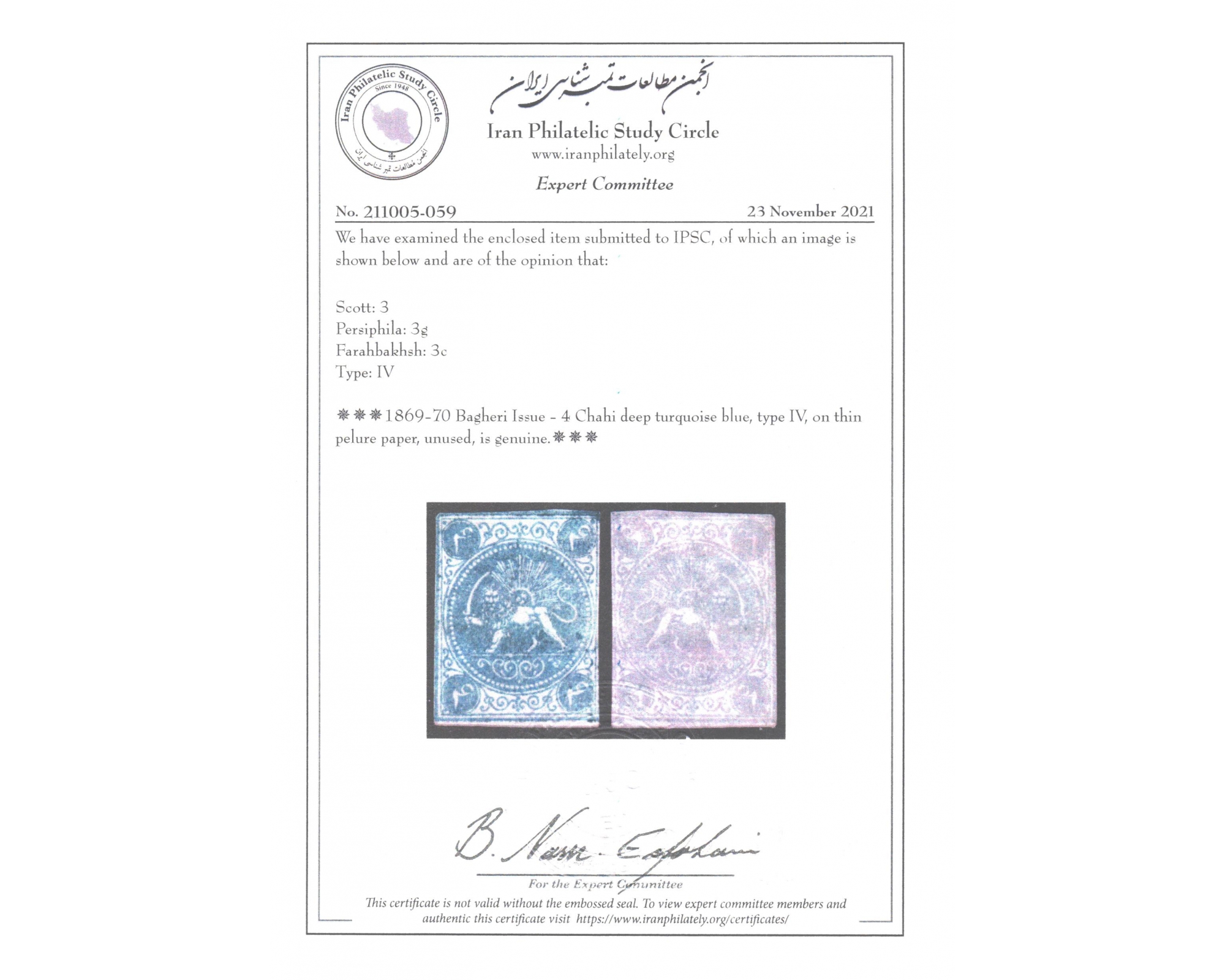 1870 4ch Bagheri Pelure Paper Certificate By IPSC