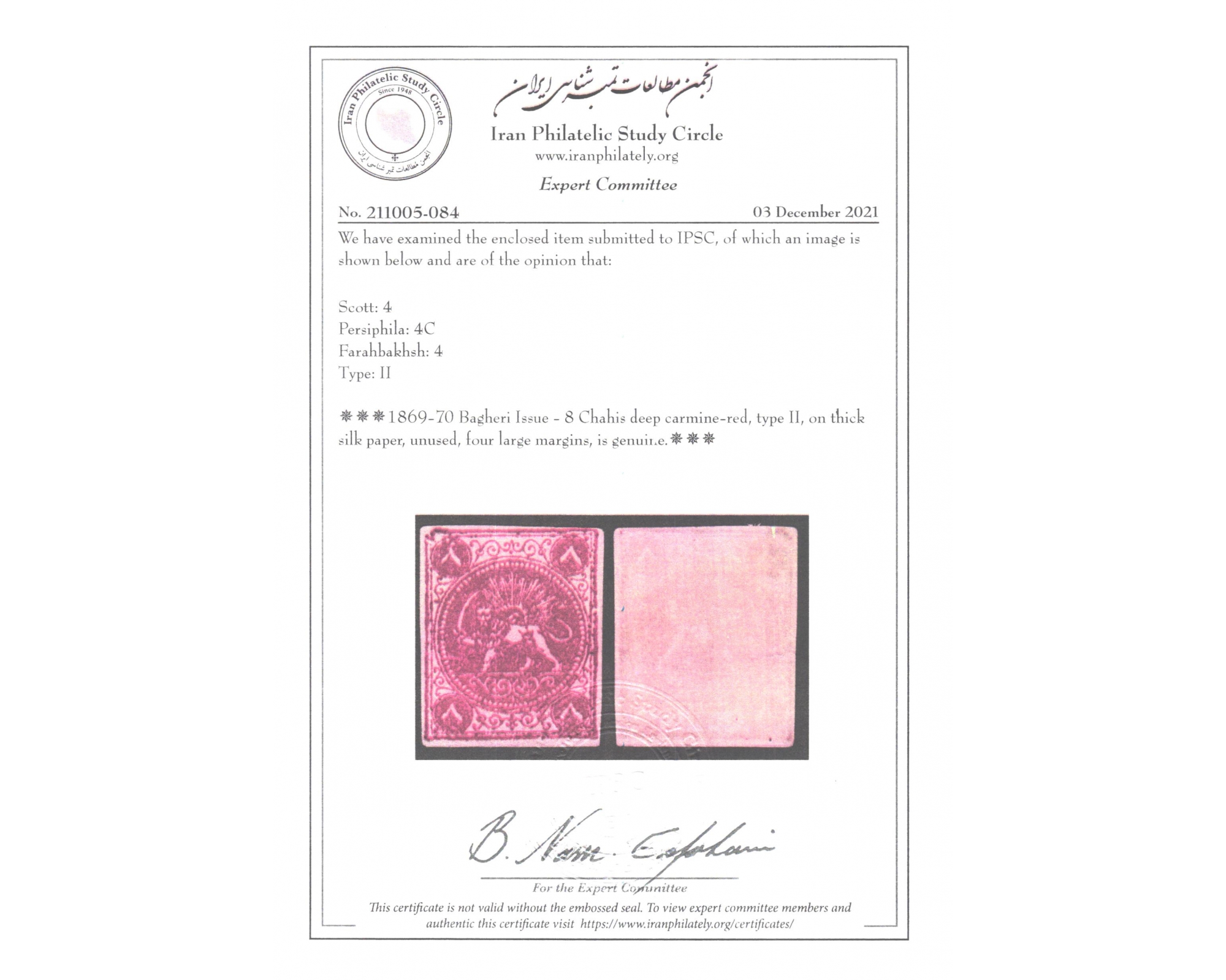 1870 8ch Bagheri Thick Silk Paper Certificate By IPSC
