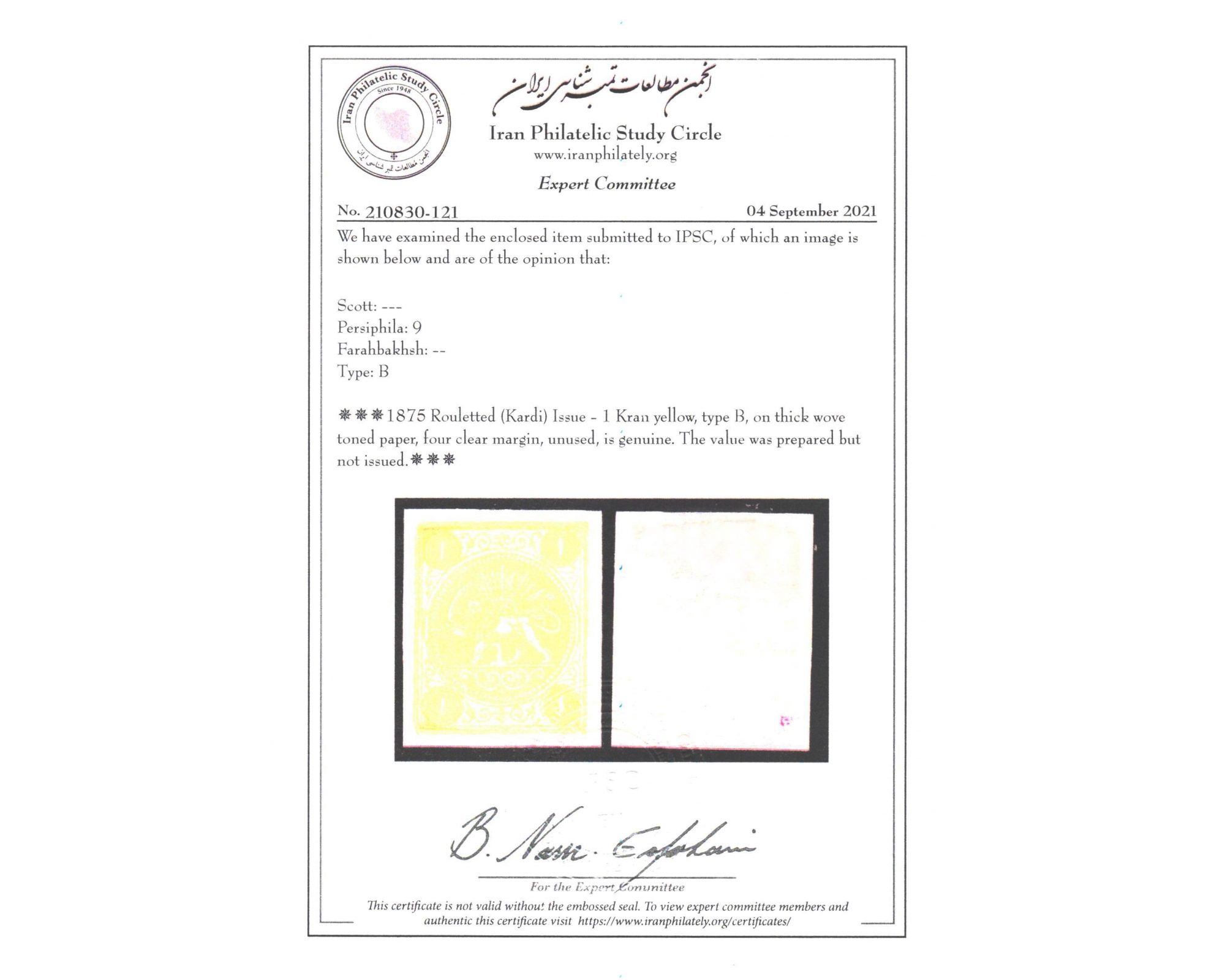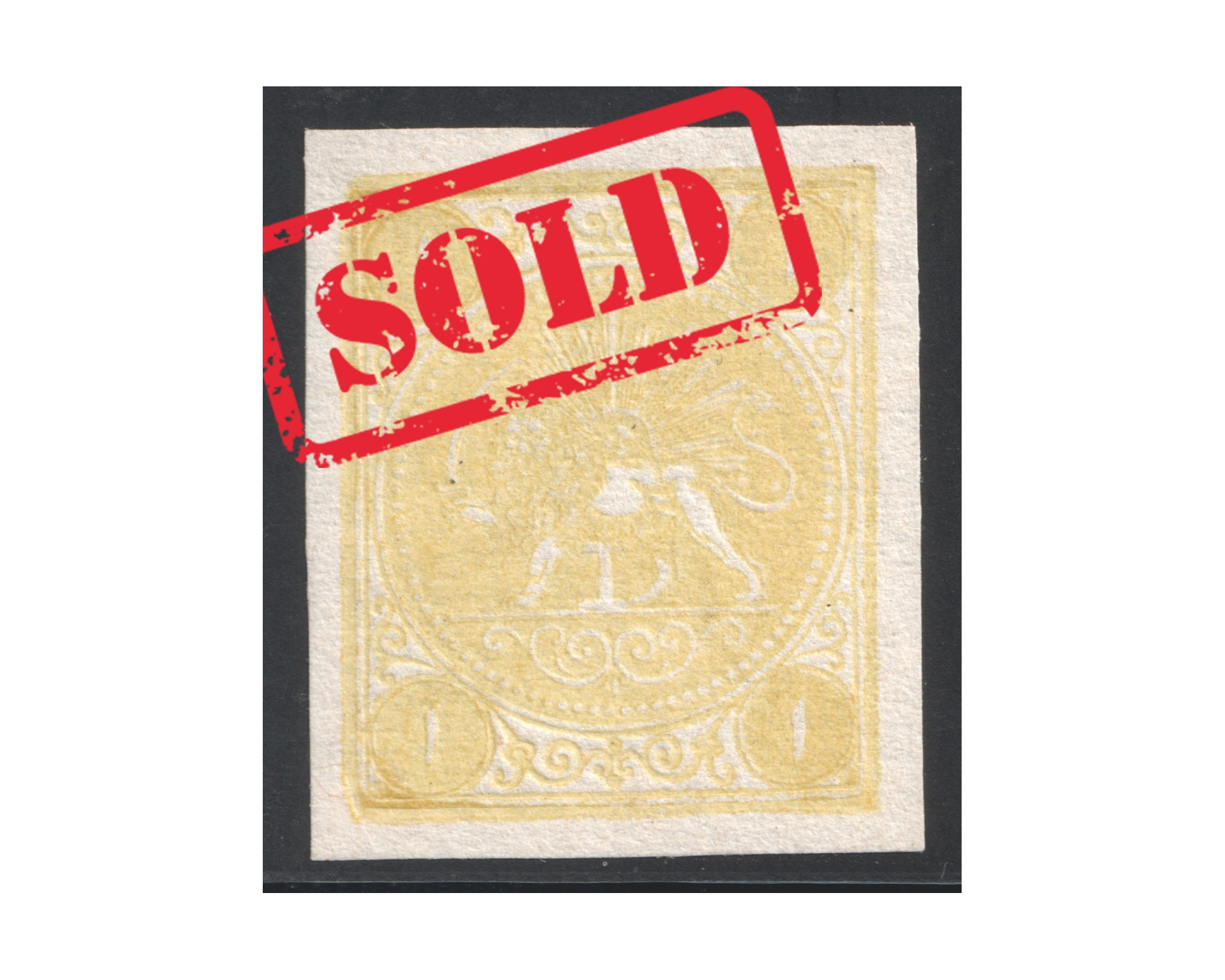 1875 Rouletted (Kardi) Issue - 1 Kran yellow, type B, on thick wove toned paper, four clear margin, unused.