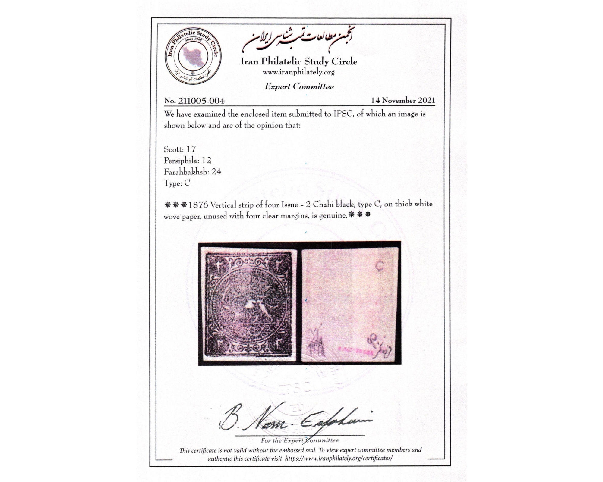 1876 Vertical Issue - 2 Chahi black, Type CCertificate by IPSCبرای دیدن با بهترین کیفیت ماوس کامپیوتر را روی تصویر تکان دهید