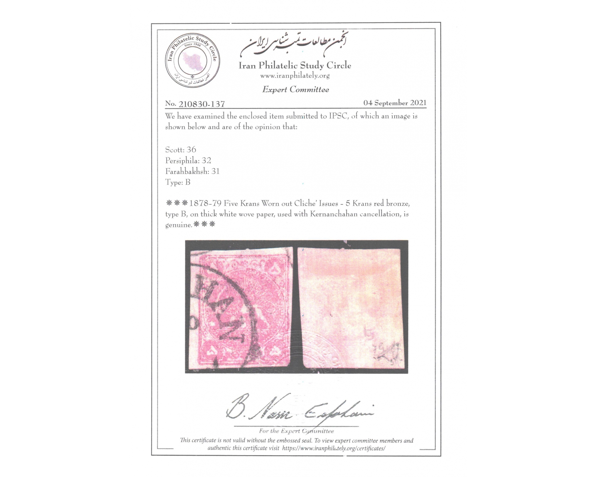 پنج قران برنز قرمز, type A Certificate by IPSC