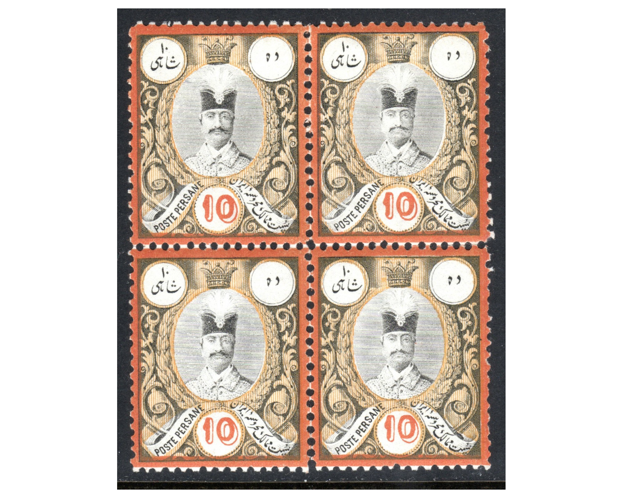 ده شاهی ناصرالدین شاه سری گراوه بلوك چهارتایی Condition; Mint Never Hinged با چسب اورجینال و بدون اثر شارژ نیه Few Perf. Separation چند دندانه افقی از سمت راست سوا شده