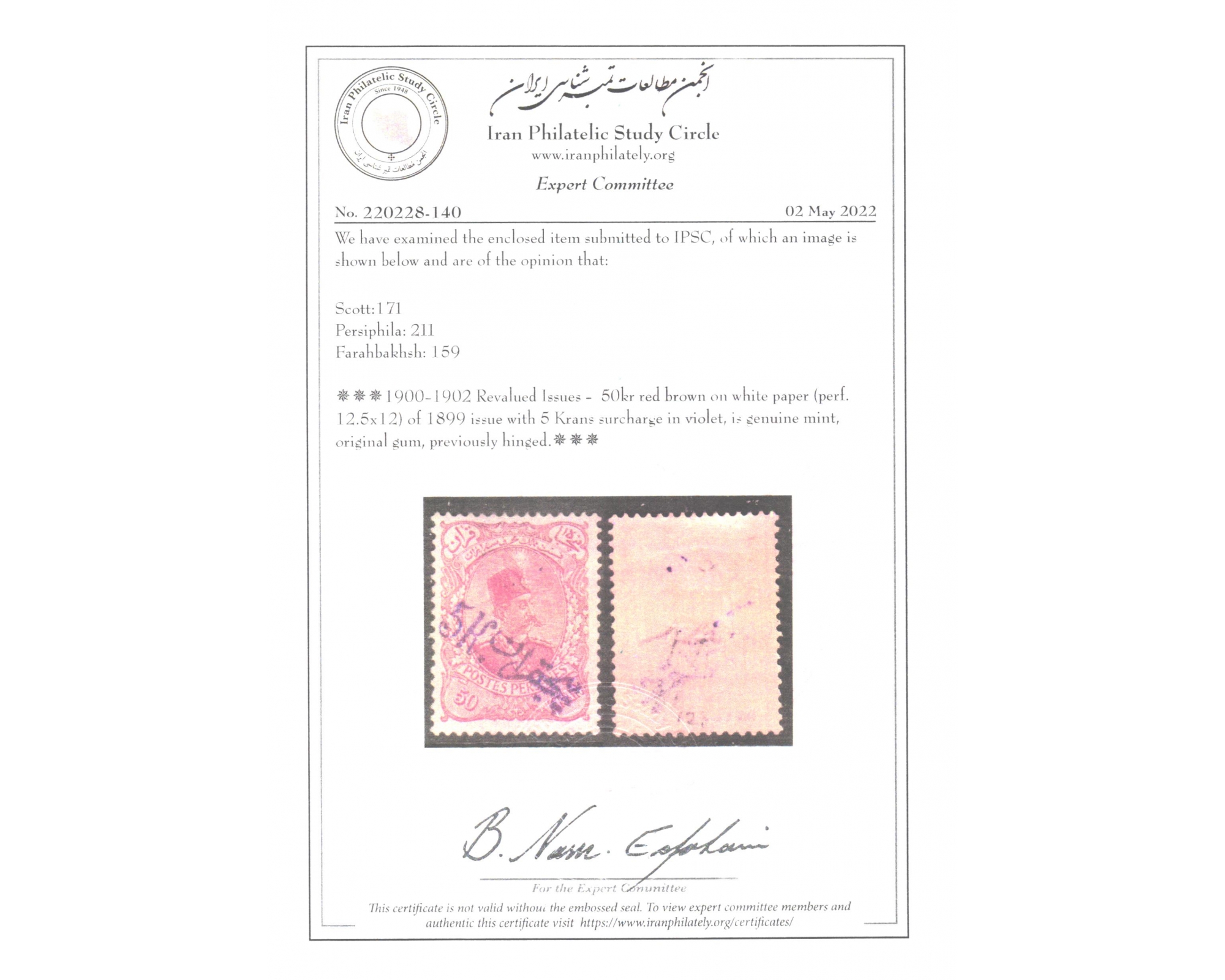 تغییر قیمت ۵ قران روی ۵۰ قرانCertificate By IPSCCondition; Mint Hinged با چسب اورجینال و با شارژ نیهبرای دیدن با بهترین کیفیت ماوس کامپیوتر را روی تصویر تکان دهید