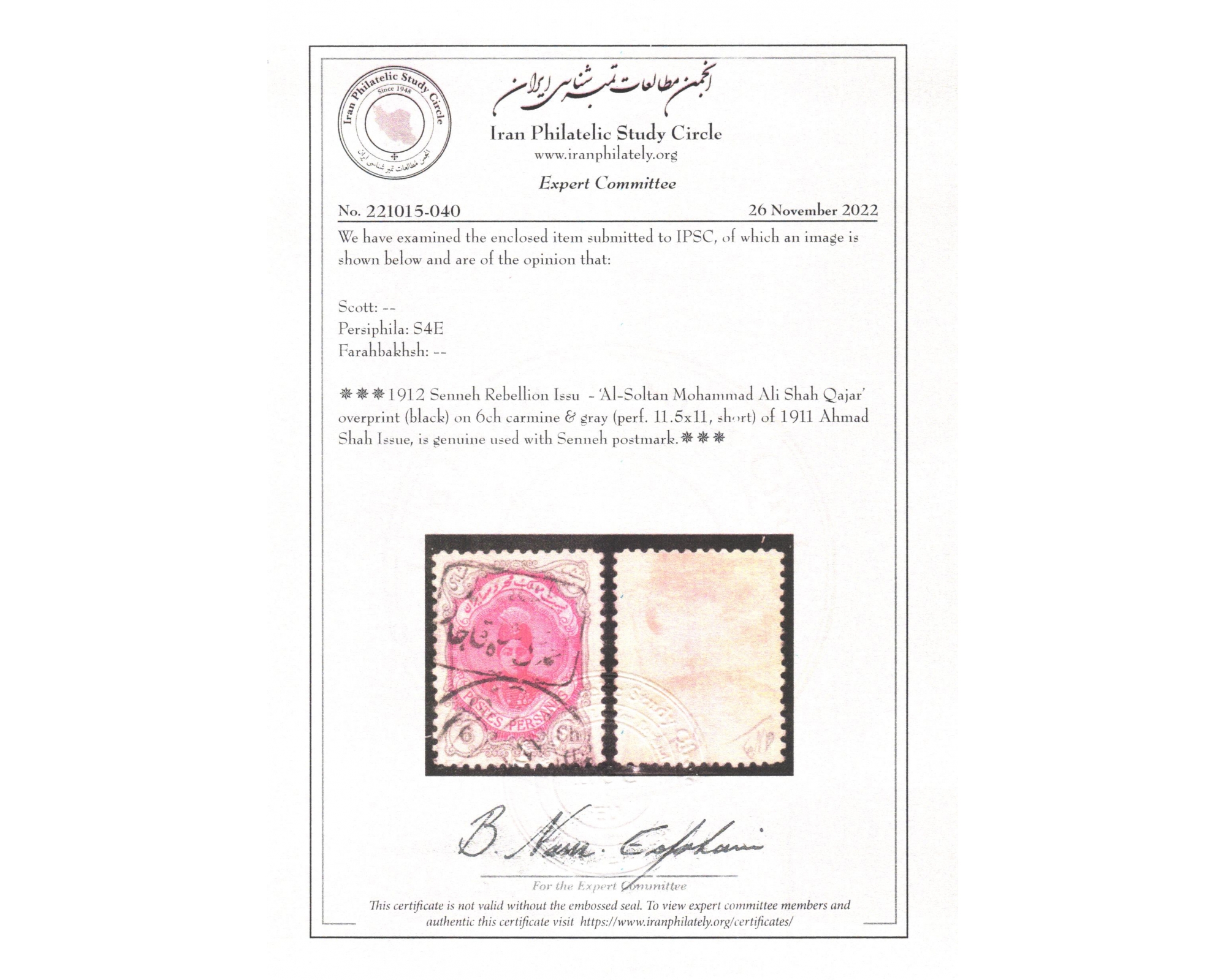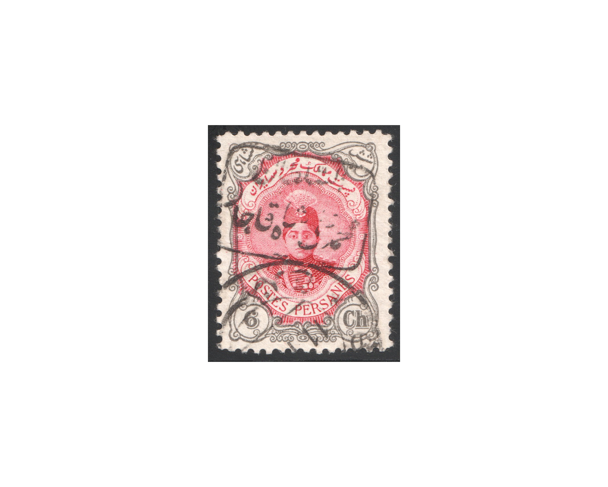 مهر دستی السلطان محمدعلی شاه قاجار روی ۶ شاهی IPSC با سرتیفیکیتPostally Usedبا مصرف واقعی پستی
