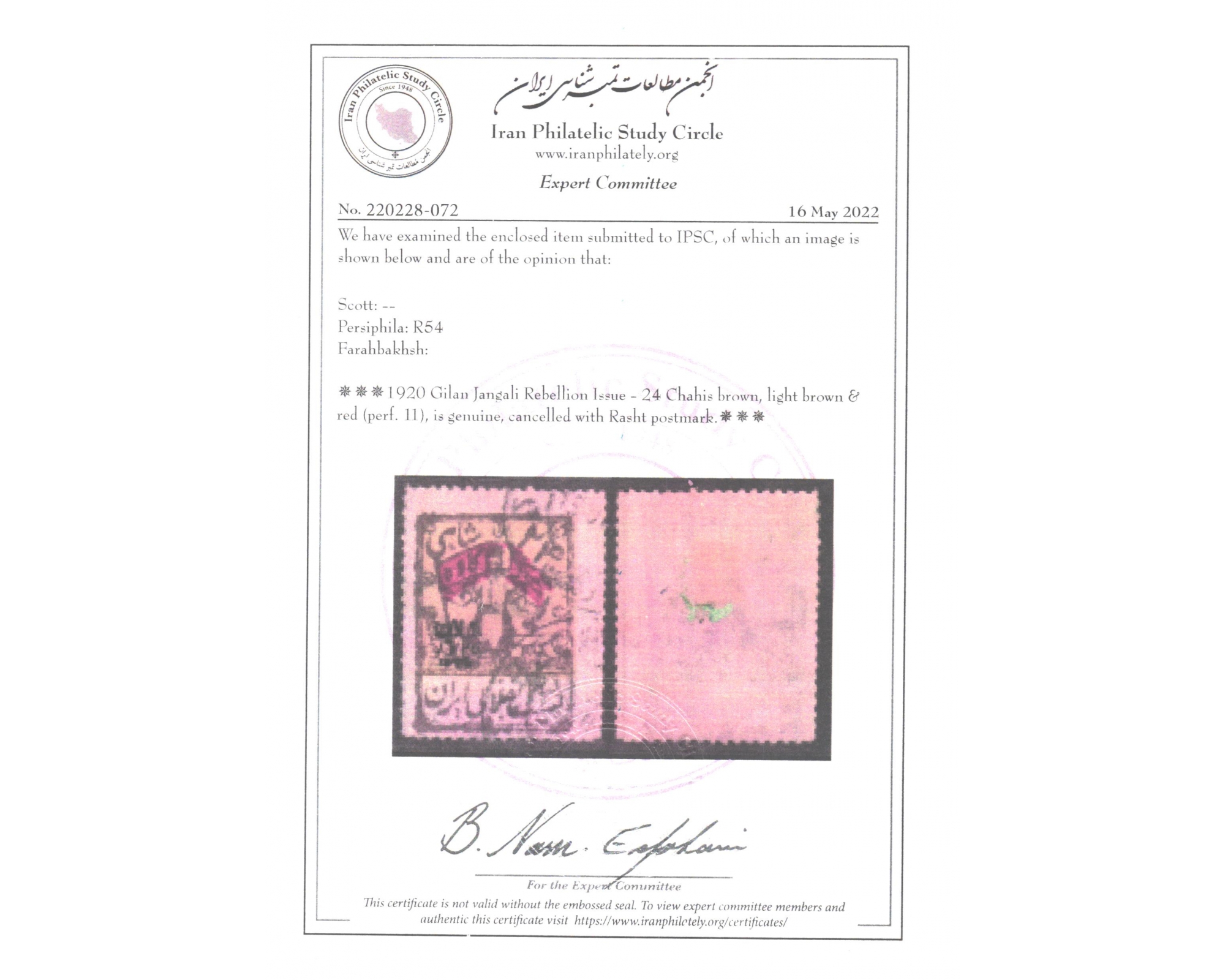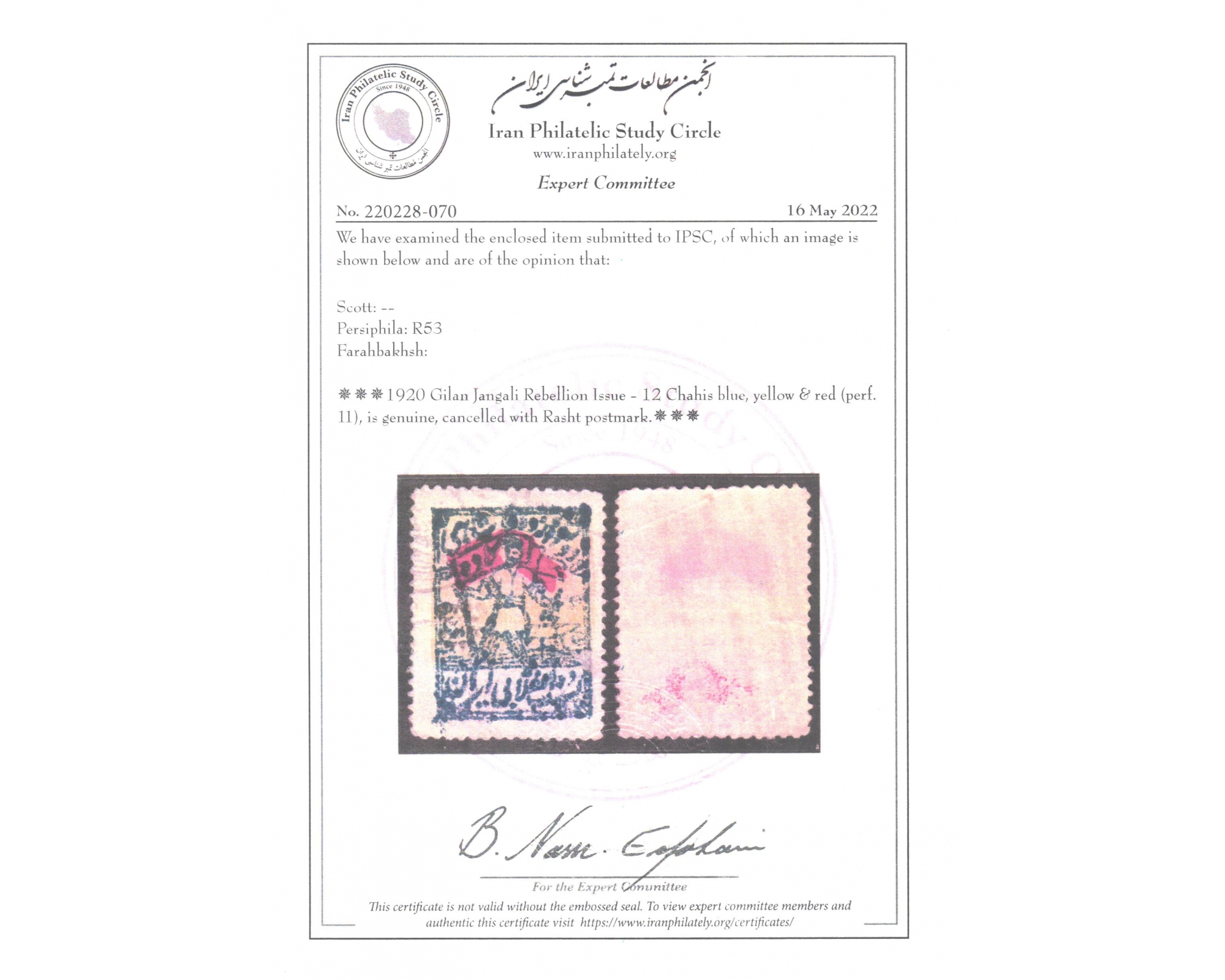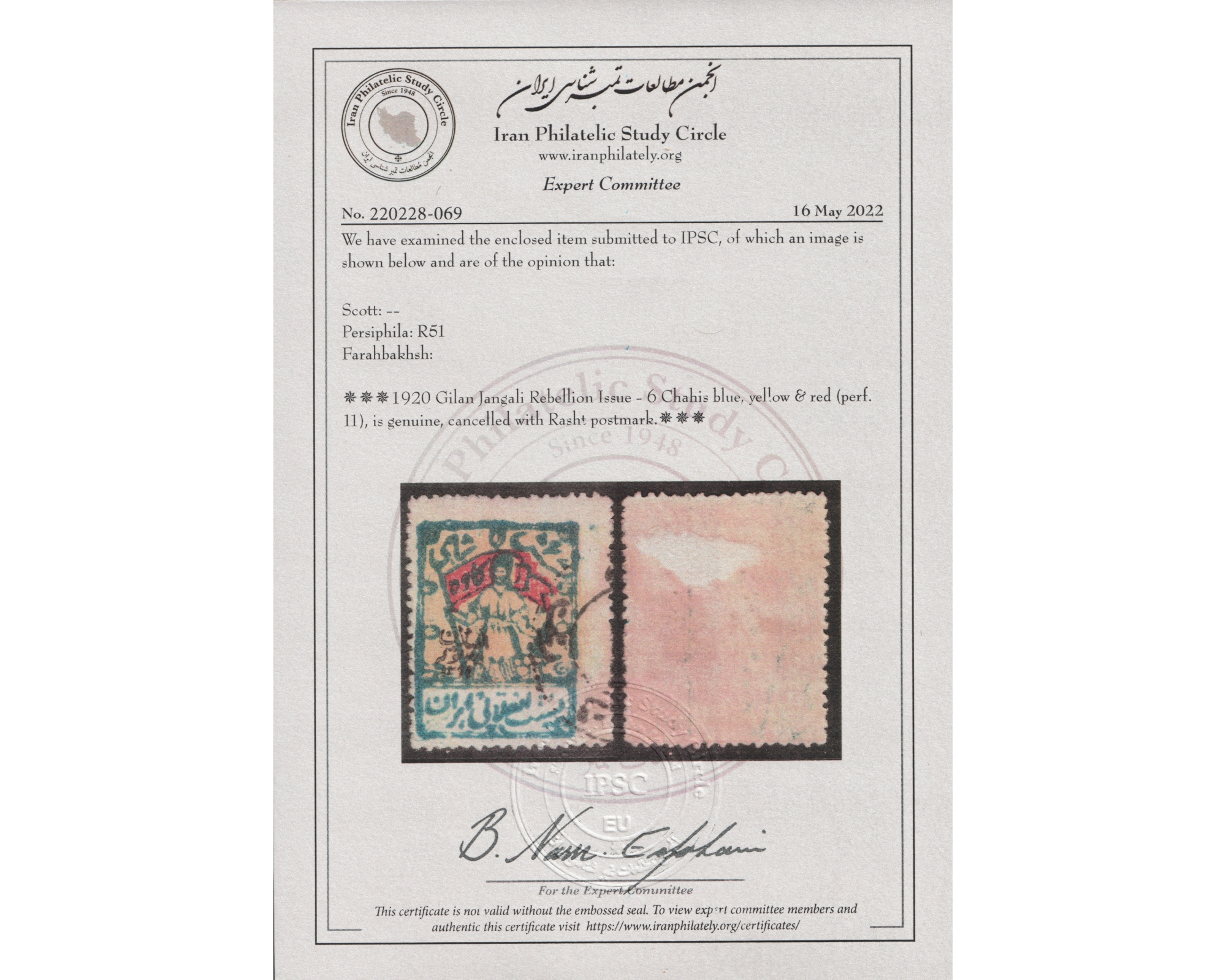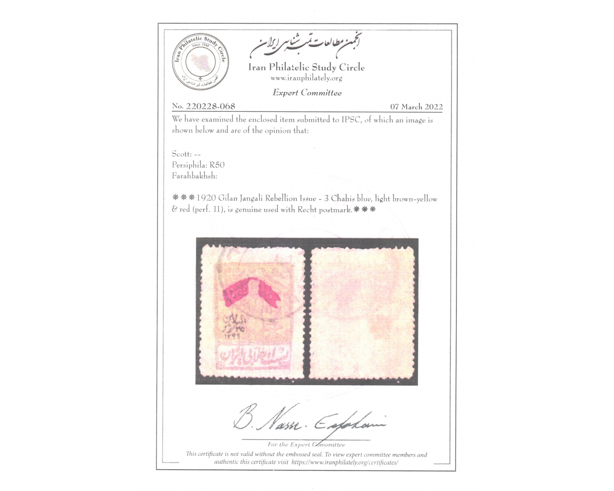 تمبرهای میرزا کوچک خان جنگلی با مصرف واقعی پستی IPSC با سرتیفیکیتThis Issue is extremely rare in Postally Used Condition