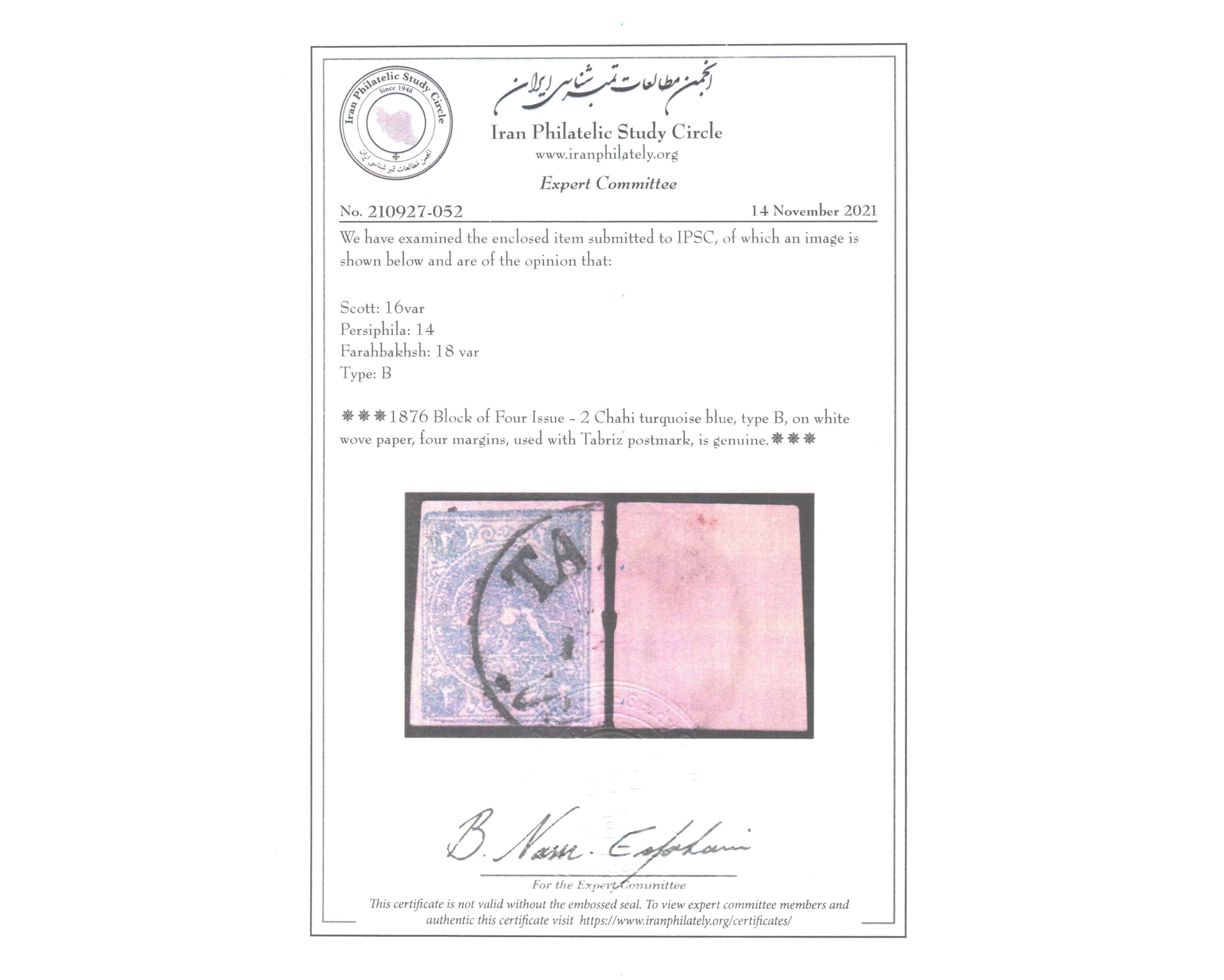 دو شاهی آبی چاپ بلوک ۴ تایینمونه های استفاده شده دو شاهی آبی بسیار نایاب هستندCertificate by IPSCبرای دیدن با بهترین کیفیت ماوس کامپیوتر را روی تصویر تکان دهید