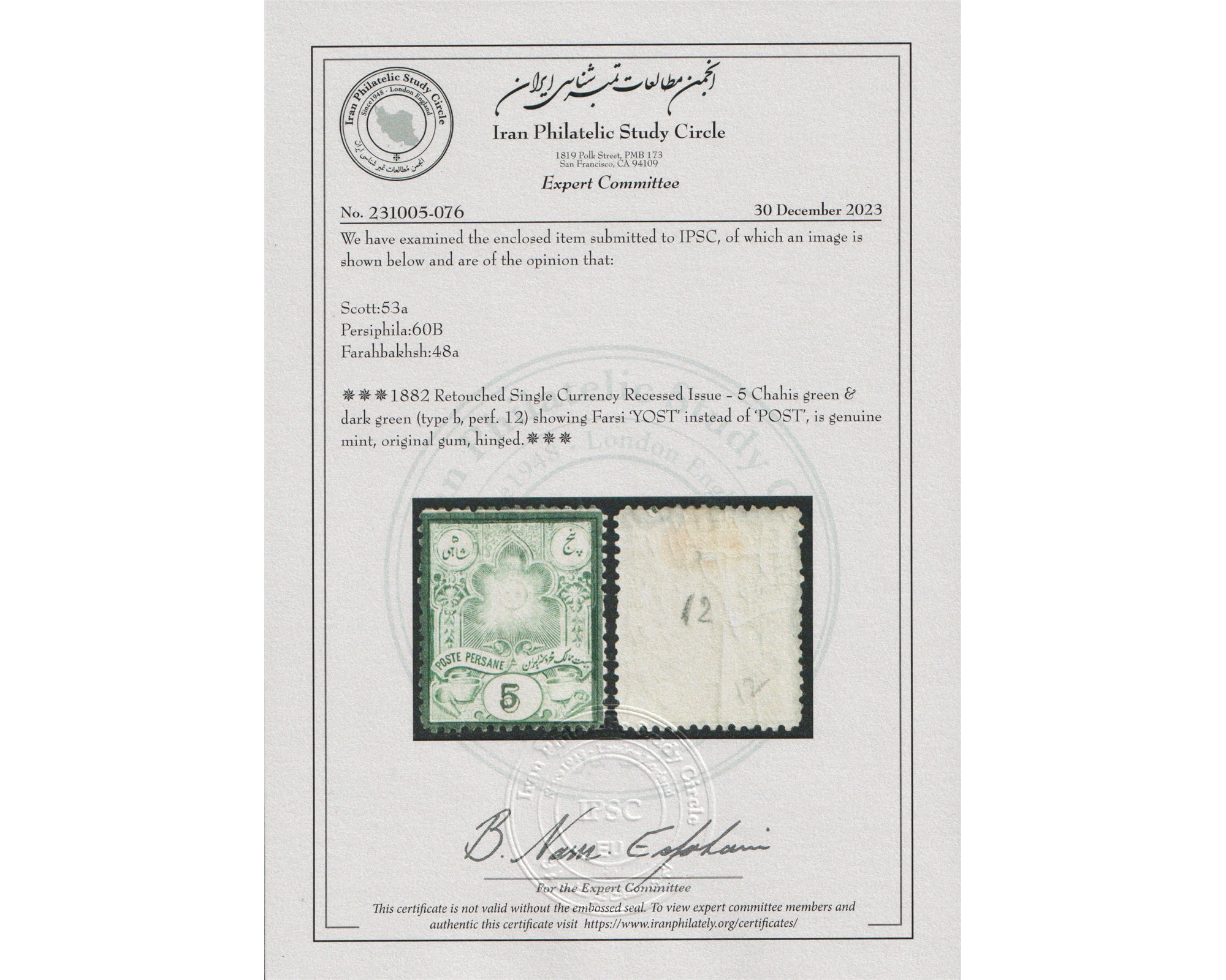 پنج شاهی سری گراوه واریته یستCondition; Mint Hinged با چسب اورجینال و شارژ نیهCertificate by IPSCبرای دیدن با بهترین کیفیت ماوس کامپیوتر را روی تصویر تکان دهید