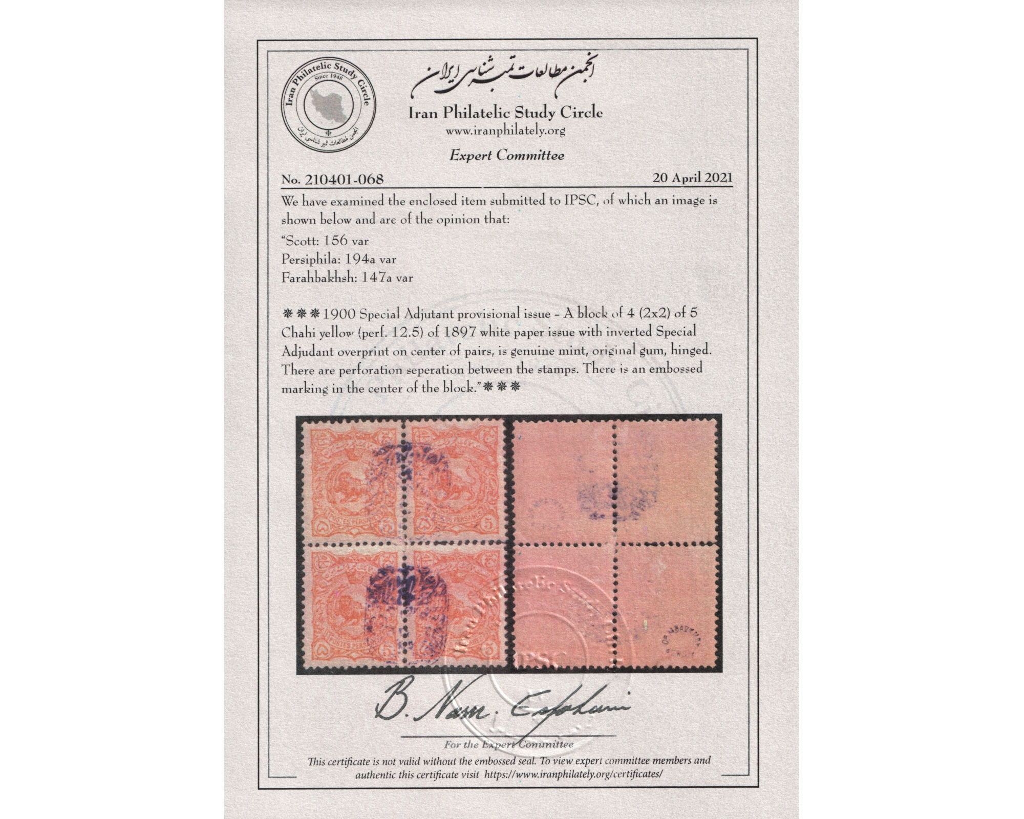 5ch 2 Pair with Inverted Overprint Certificated by IPSC یک مهر برجسته در وسط بلوک وجود دارد Condition: Original Gum Hinged کیفیت ; با چسب اصلی و شارنیه