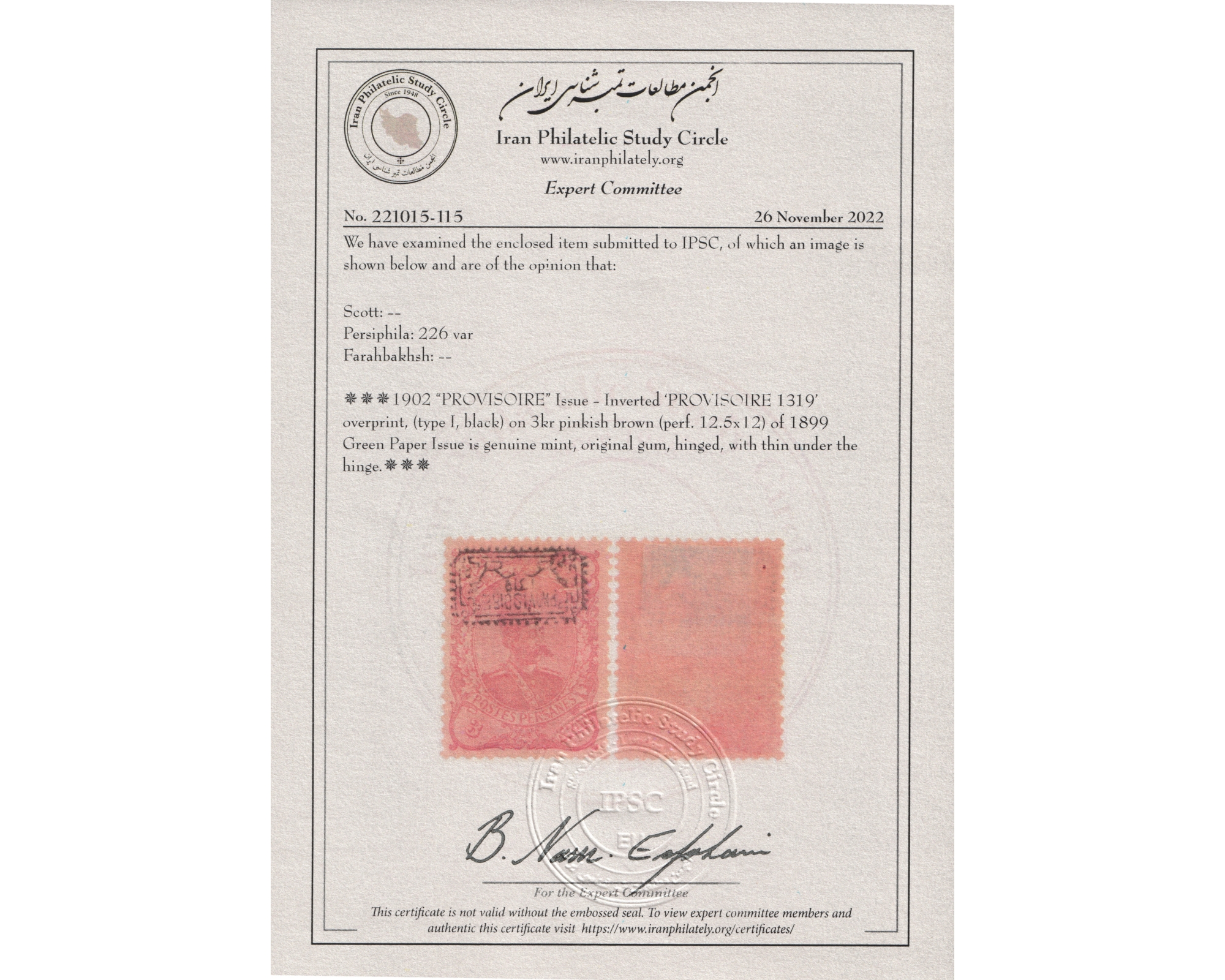 Certificate By IPSC Condition; Mint Hinged & Thin under the Hinge مقداری پوست کن زیر شارنیه این دو تمبر تا به امروز تنها ارورهایی هستند که رکورد شدهاند
