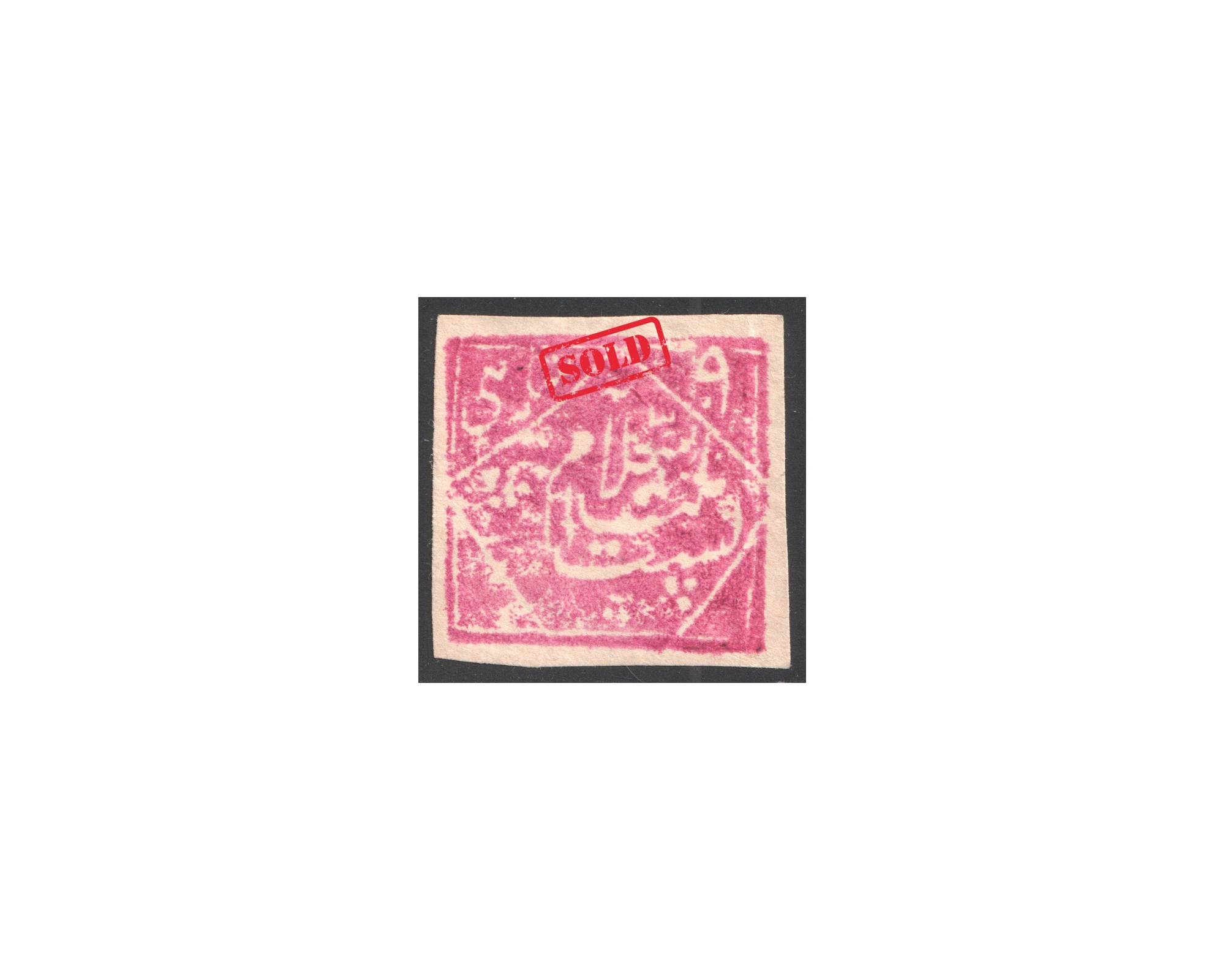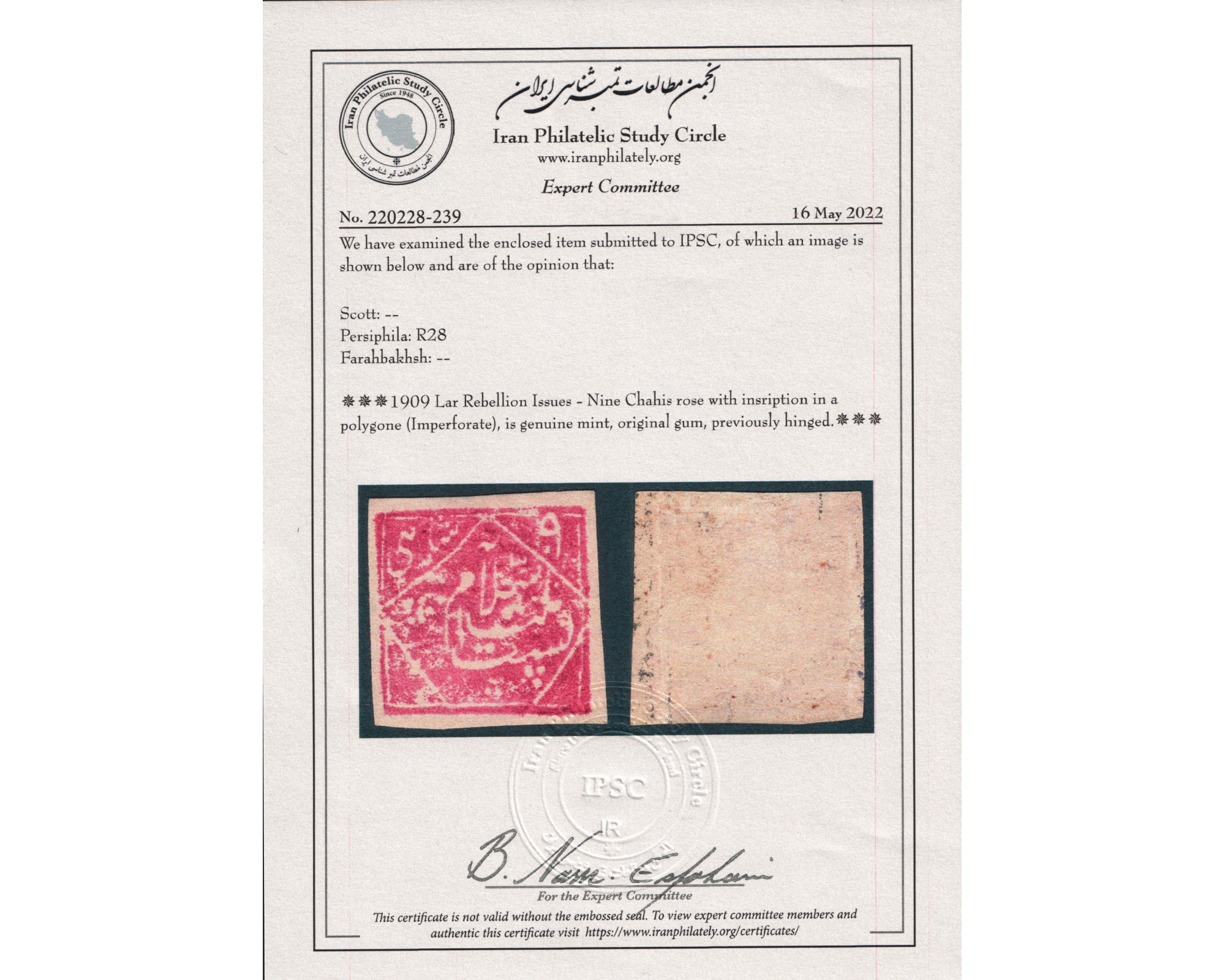 تمبر نایاب و یونیک 9 شاهی انقلابی لار به رنگ قرمز صورتی. تنها نمونه دیده شده به صورت مینت با چسب کامل و کیفیت عالی. این تمبر یکی از نایاب ترین تمبرهای فیلاتلی ایران است و نمونه مینت تا به حال در هیچ کاتالوگی لیست نشده است و تنها همین نمونه دیده شده است
